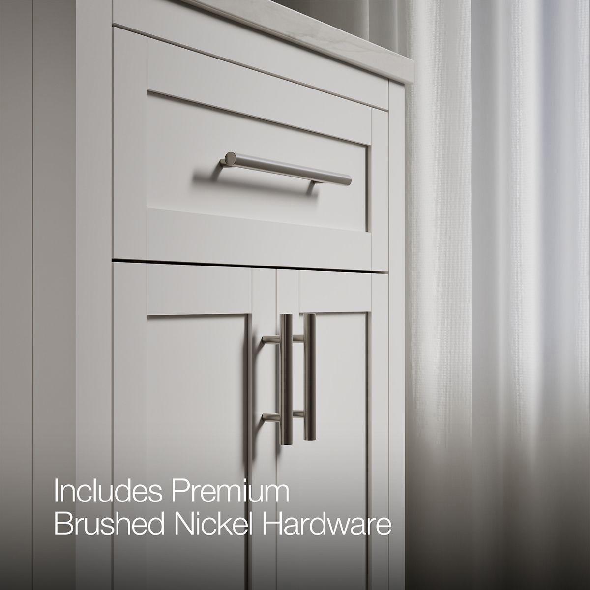 - Brushed Nickel hardware included on the White, Atmos Grey, and Light Oak vanities