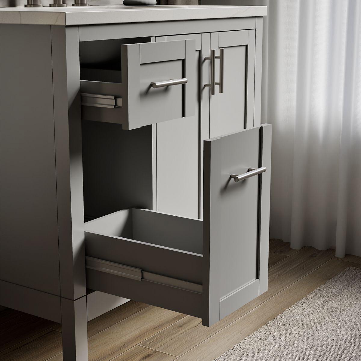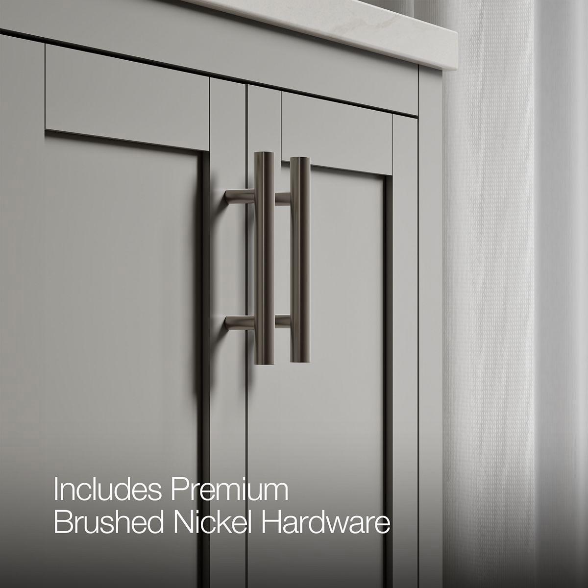 - Brushed Nickel hardware included on the White, Atmos Grey, and Light Oak vanities