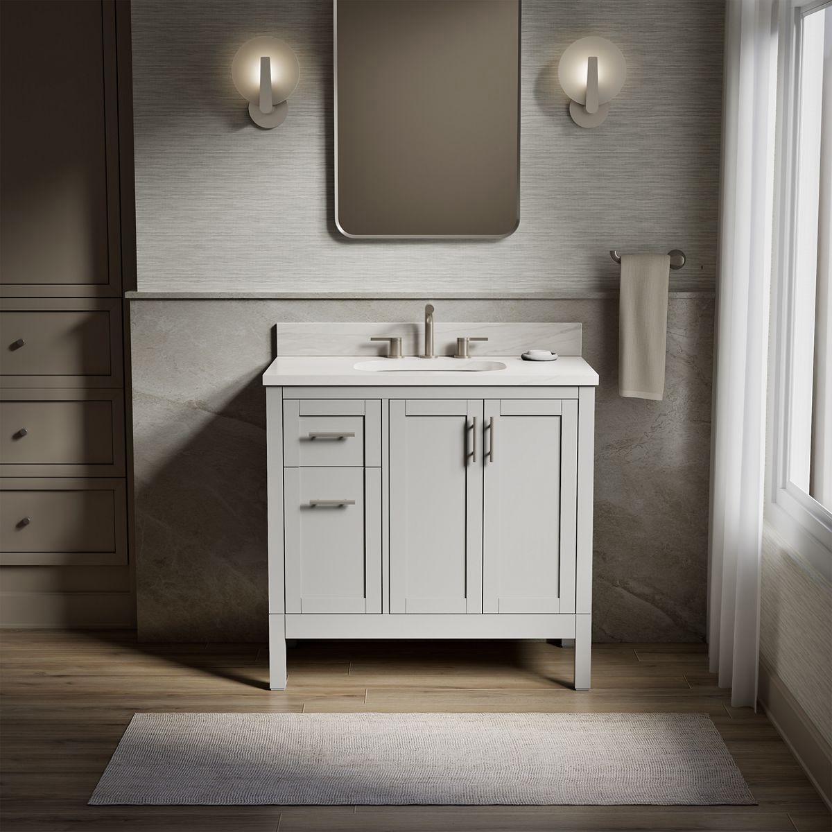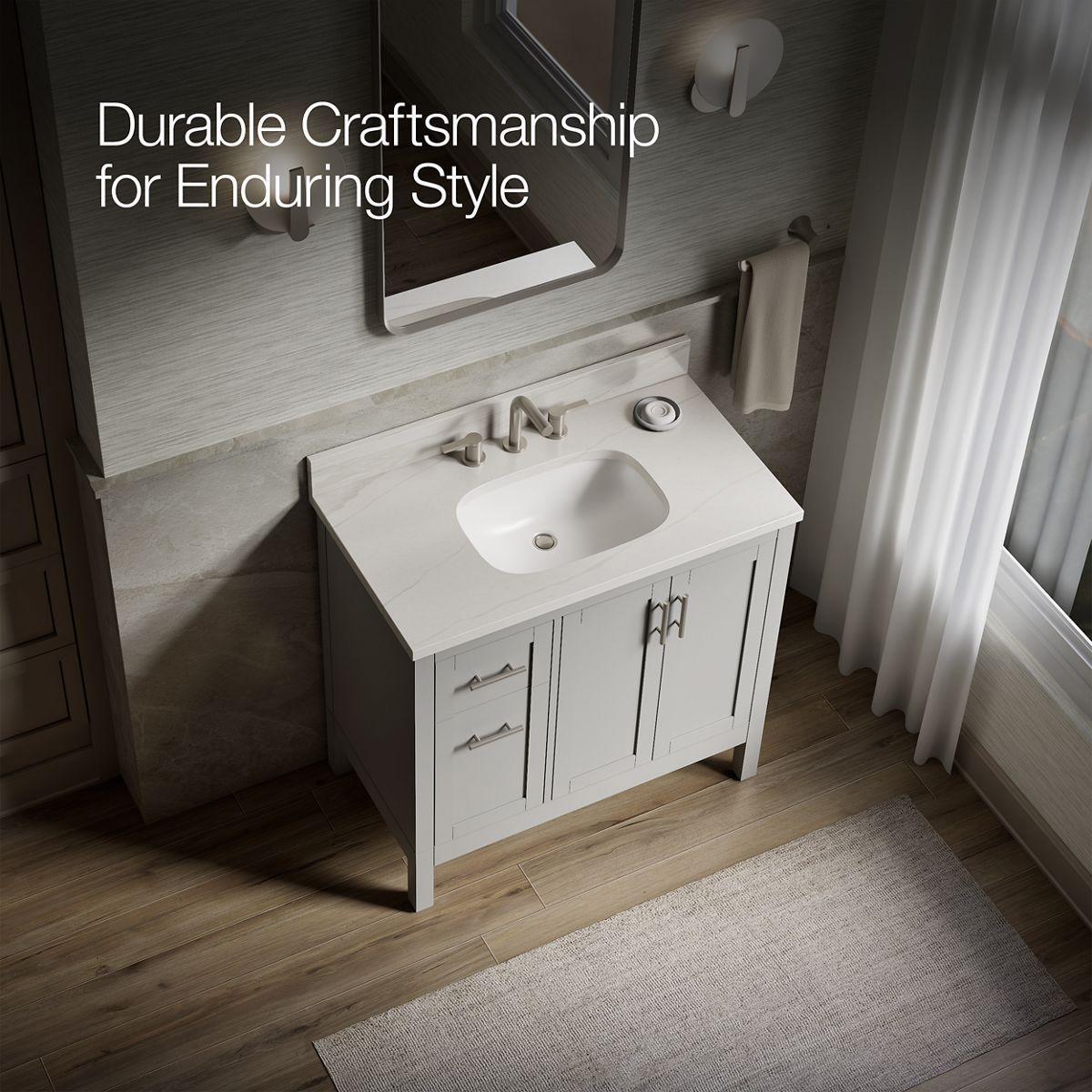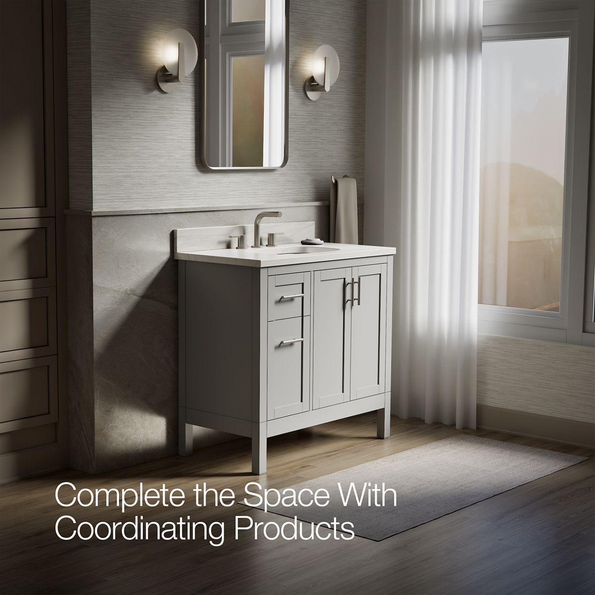 In typical Shaker style, the Hadron bathroom vanity set is a classic. Its modest, clean design doesn’t overpower your bathroom — it blends into it — lending itself to many decorating styles. The Hadron vanity set includes cabinet, quartz countertop, sink, and Vibrant Brushed Nickel hardware. Pair with any KOHLER widespread bathroom sink faucet for your own unique touch.