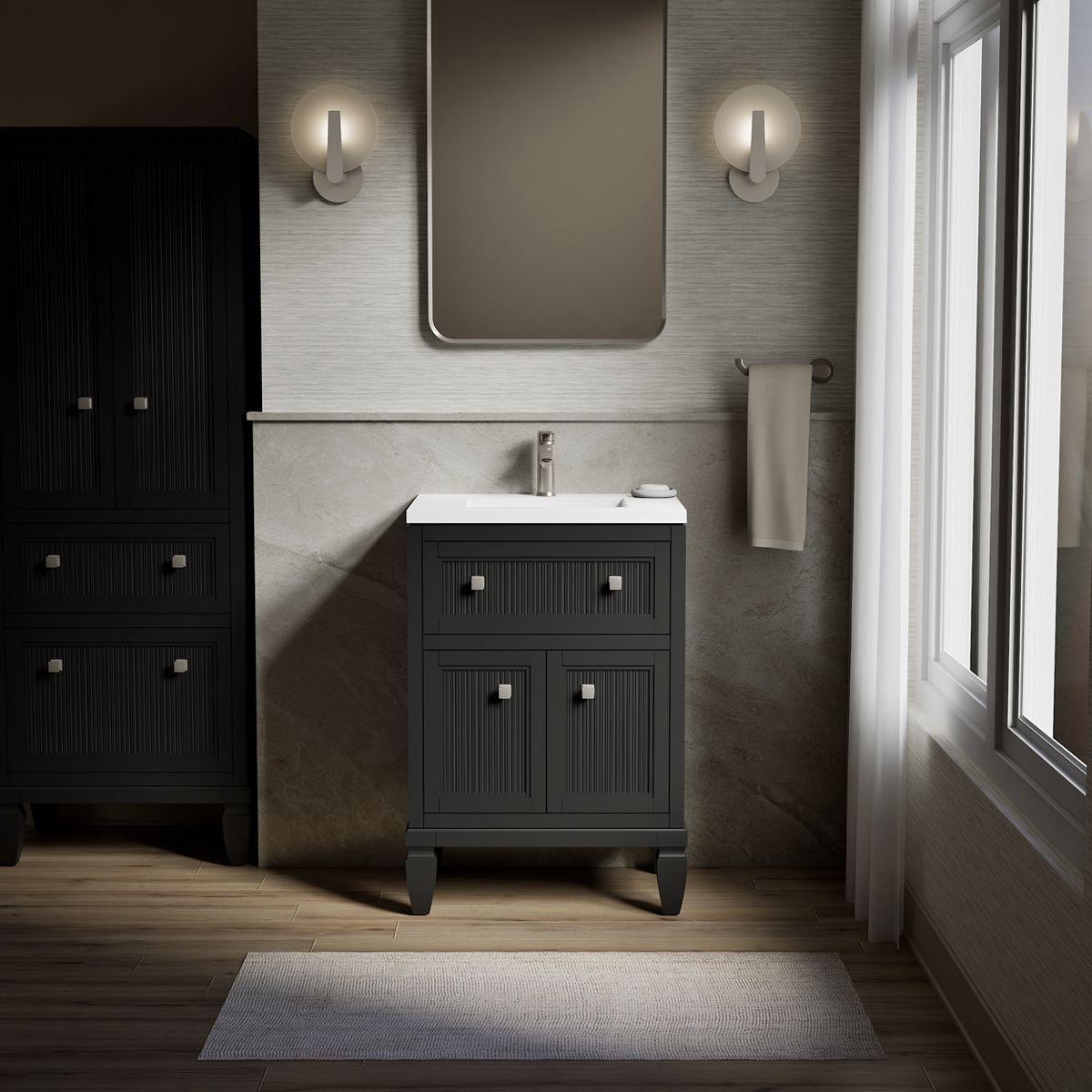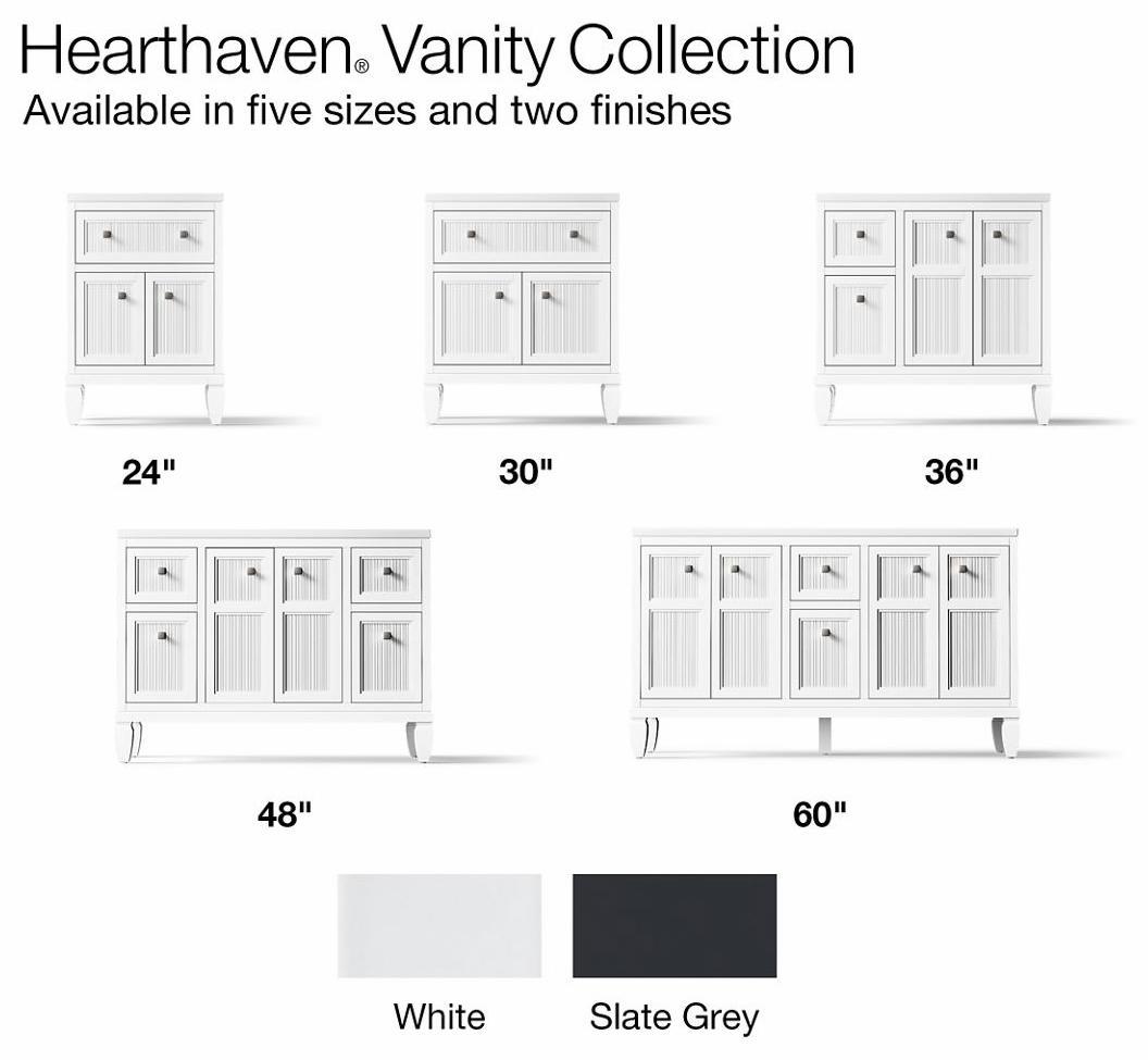 Neoclassical detailing embraces modern design and colors in the texturally captivating Hearthaven collection. Featuring ribbed panels inset on picture frame-like stacked drawer and door molding, Hearthaven vanities get a lift from chunky tapered feet. Traditional shaped cabinets adorned with classic Vibrant Brushed Nickel hardware, Hearthaven pieces come ready for do-it-yourself installers. Personalize your bathroom furniture with choice of color; cabinet, countertop, sink, and Vibrant Brushed Nickel hardware are included with the vanity set. Additional hardware finishes are also available.