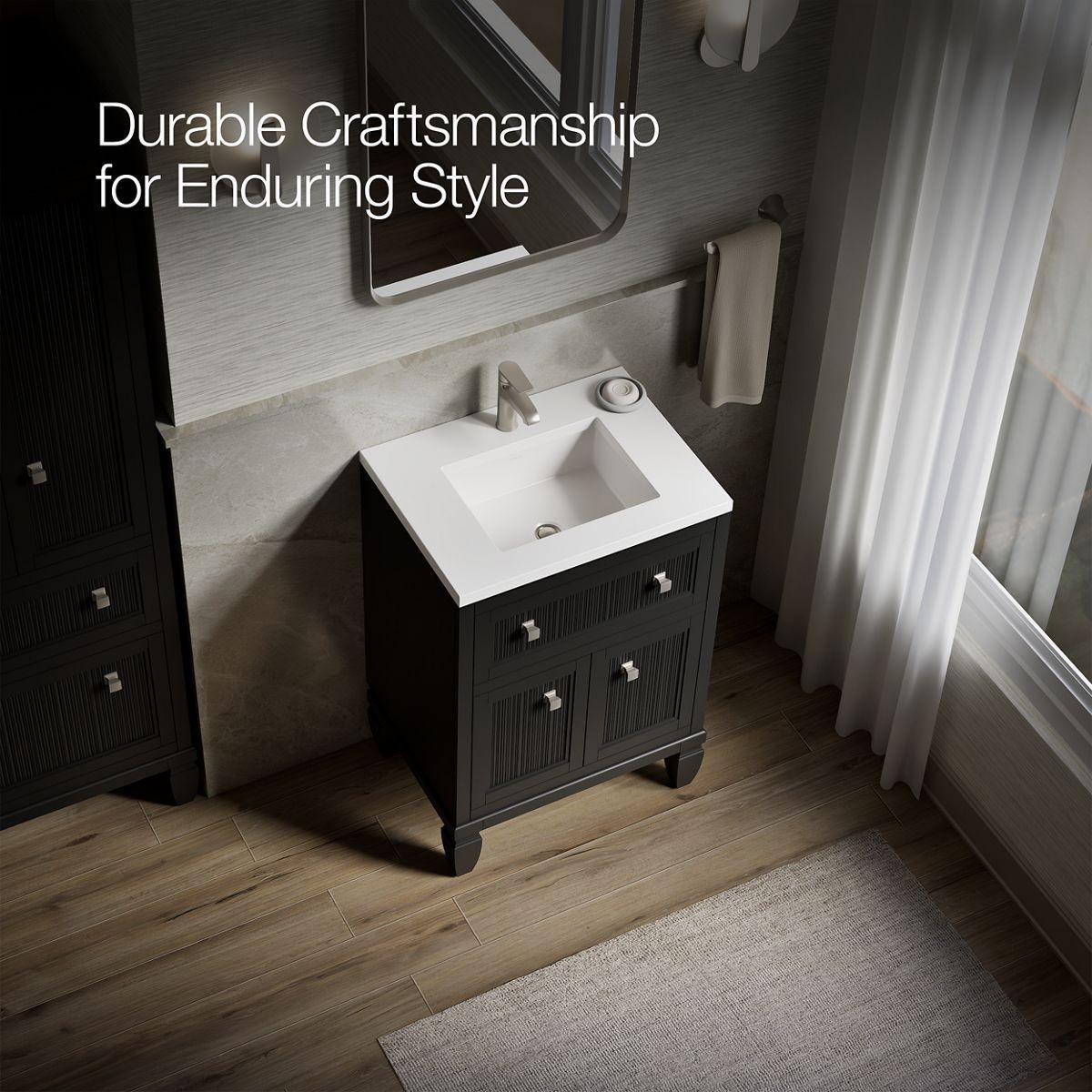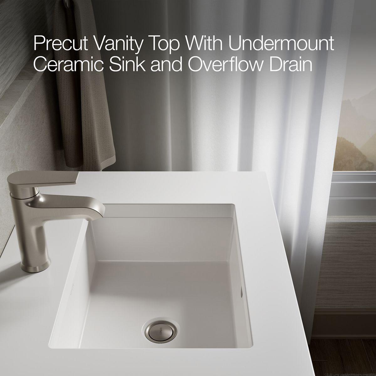 - Pure White (PWH) quartz vanity top adds beauty and long-lasting durability