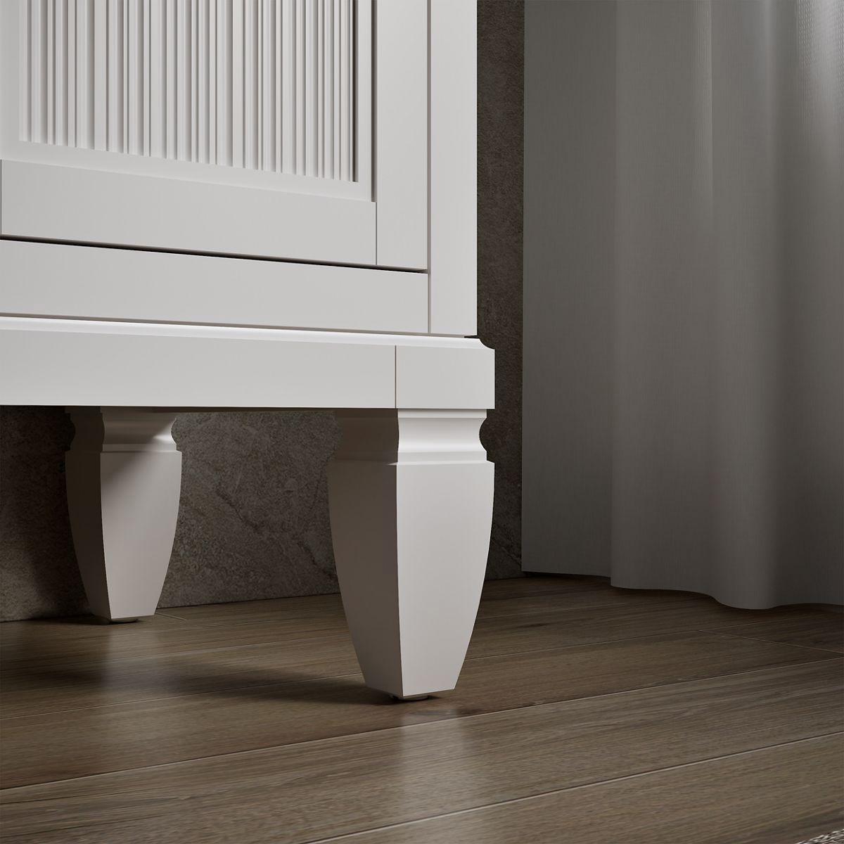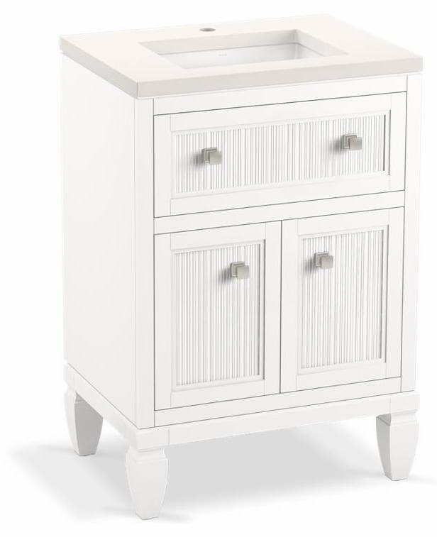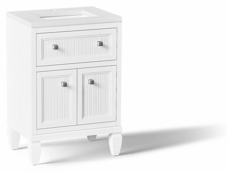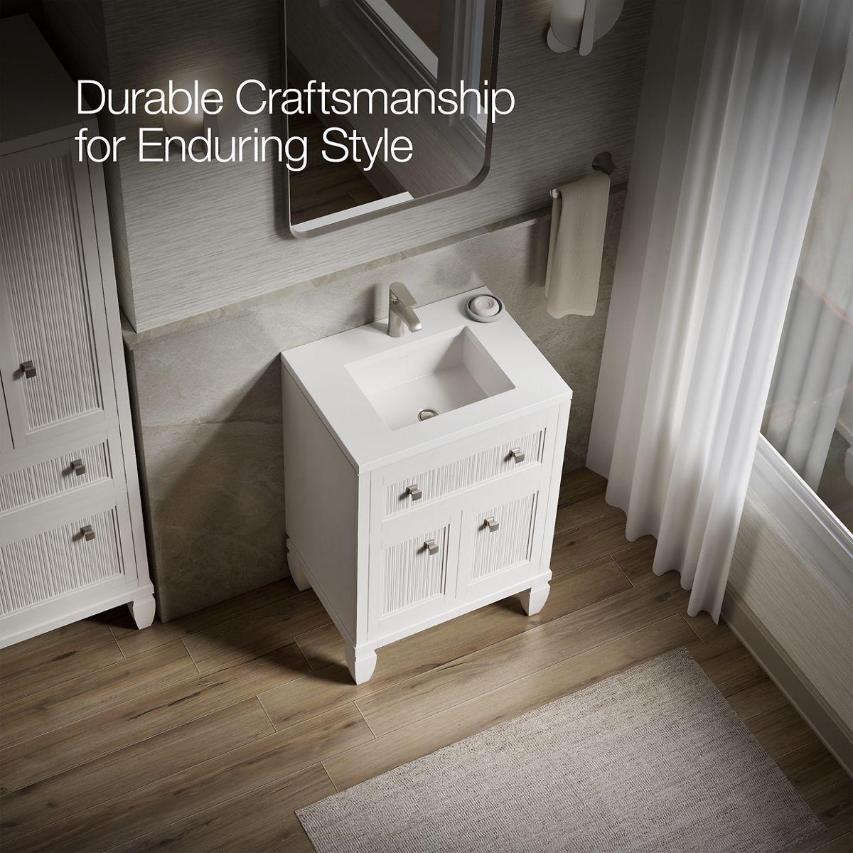 Neoclassical detailing embraces modern design and colors in the texturally captivating Hearthaven collection. Featuring ribbed panels inset on picture frame-like stacked drawer and door molding, Hearthaven vanities get a lift from chunky tapered feet. Traditional shaped cabinets adorned with classic Vibrant Brushed Nickel hardware, Hearthaven pieces come ready for do-it-yourself installers. Personalize your bathroom furniture with choice of color; cabinet, countertop, sink, and Vibrant Brushed Nickel hardware are included with the vanity set. Additional hardware finishes are also available.