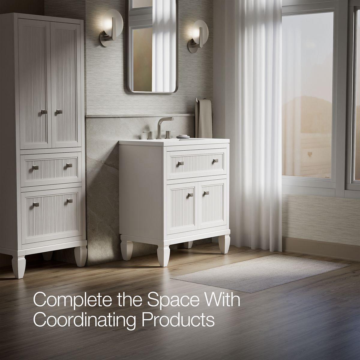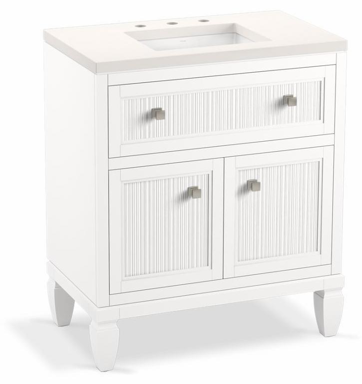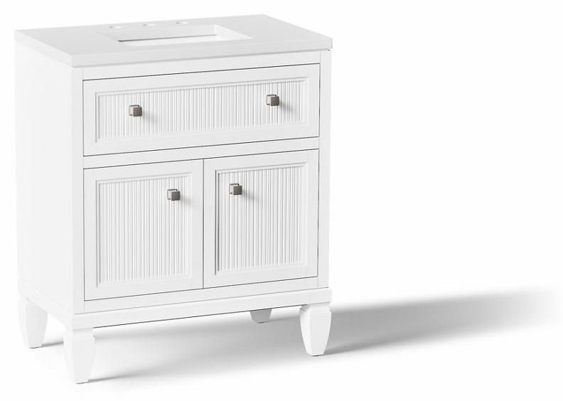 Neoclassical detailing embraces modern design and colors in the texturally captivating Hearthaven collection. Featuring ribbed panels inset on picture frame-like stacked drawer and door molding, Hearthaven vanities get a lift from chunky tapered feet. Traditional shaped cabinets adorned with classic Vibrant Brushed Nickel hardware, Hearthaven pieces come ready for do-it-yourself installers. Personalize your bathroom furniture with choice of color; cabinet, countertop, sink, and Vibrant Brushed Nickel hardware are included with the vanity set. Additional hardware finishes are also available.