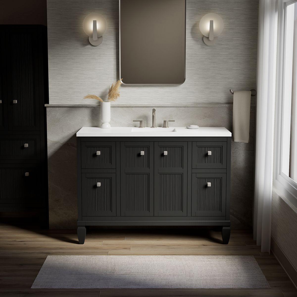 Neoclassical detailing embraces modern design and colors in the texturally captivating Hearthaven collection. Featuring ribbed panels inset on picture frame-like stacked drawer and door molding, Hearthaven vanities get a lift from chunky tapered feet. Traditional shaped cabinets adorned with classic Vibrant Brushed Nickel hardware, Hearthaven pieces come ready for do-it-yourself installers. Personalize your bathroom furniture with choice of color; cabinet, countertop, sink, and Vibrant Brushed Nickel hardware are included with the vanity set. Additional hardware finishes are also available.