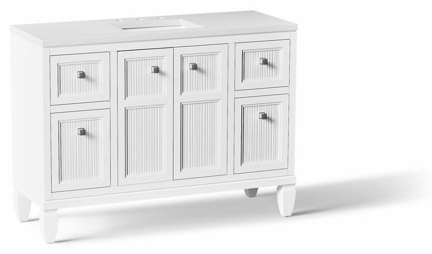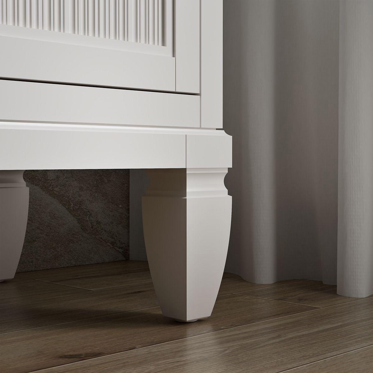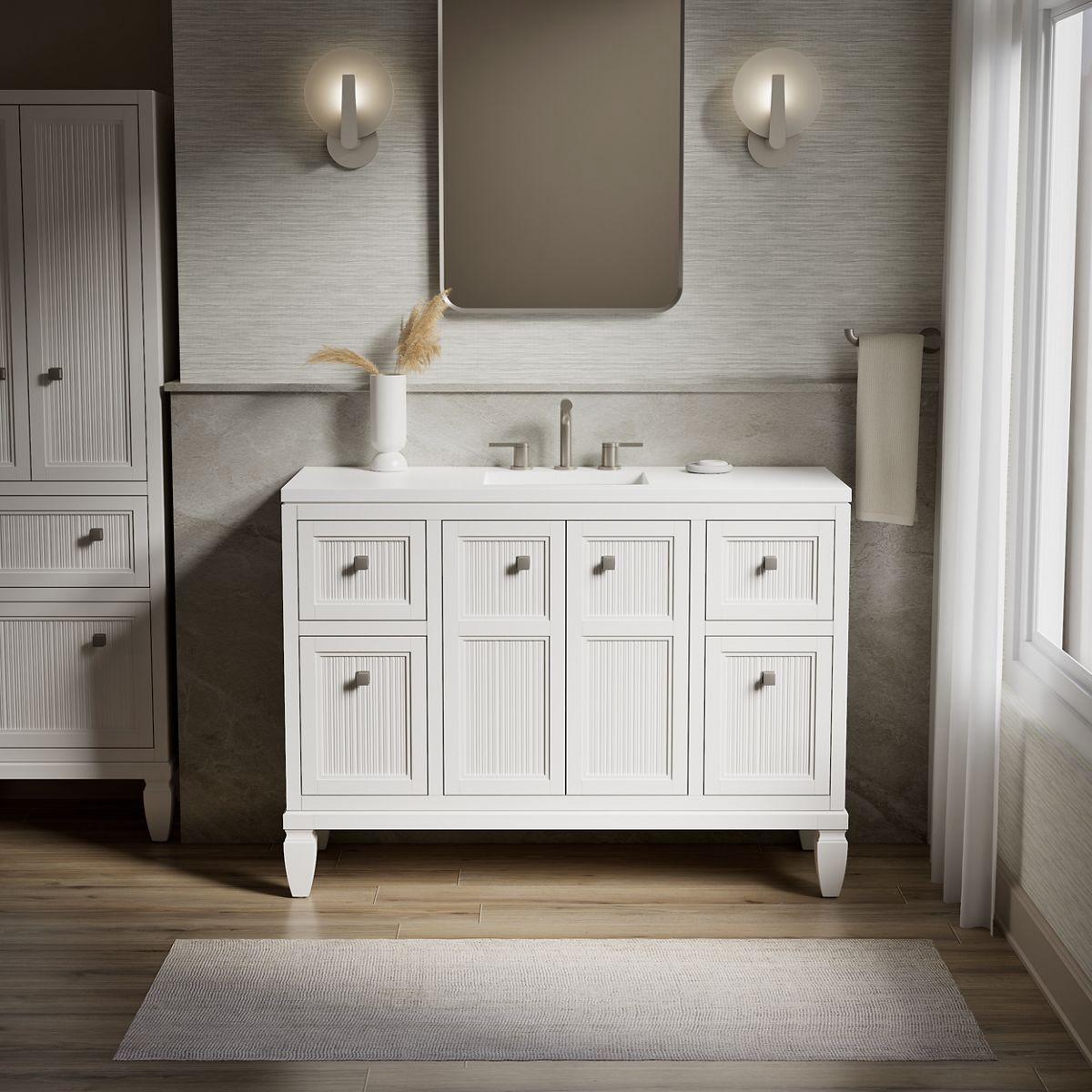 Neoclassical detailing embraces modern design and colors in the texturally captivating Hearthaven collection. Featuring ribbed panels inset on picture frame-like stacked drawer and door molding, Hearthaven vanities get a lift from chunky tapered feet. Traditional shaped cabinets adorned with classic Vibrant Brushed Nickel hardware, Hearthaven pieces come ready for do-it-yourself installers. Personalize your bathroom furniture with choice of color; cabinet, countertop, sink, and Vibrant Brushed Nickel hardware are included with the vanity set. Additional hardware finishes are also available.