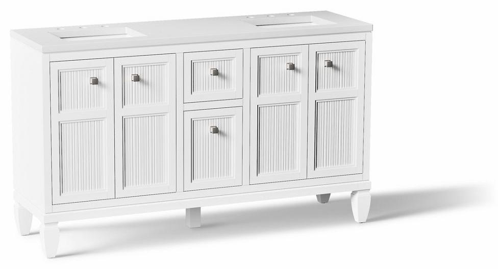 Neoclassical detailing embraces modern design and colors in the texturally captivating Hearthaven collection. Featuring ribbed panels inset on picture frame-like stacked drawer and door molding, Hearthaven vanities get a lift from chunky tapered feet. Traditional shaped cabinets adorned with classic Vibrant Brushed Nickel hardware, Hearthaven pieces come ready for do-it-yourself installers. Personalize your bathroom furniture with choice of color; cabinet, countertop, sinks, and Vibrant Brushed Nickel hardware are included with the vanity set. Additional hardware finishes are also available.