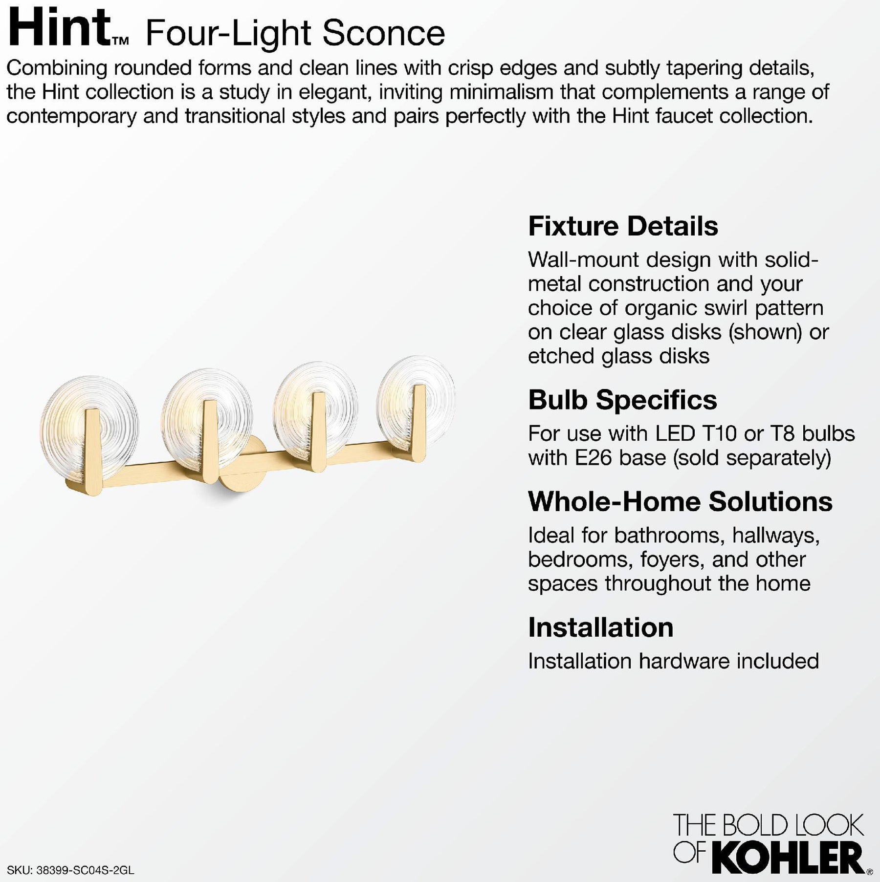 Minimalist in its design, the Hint lighting collection is a versatile style choice for both traditional and contemporary environments. This clean, elemental four-light sconce draws your attention to the soft glow of etched glass disks that gently diffuse light and give your room a calming warmth. Available in a variety of finishes to adorn any room in your home.
