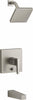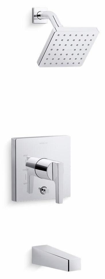- Includes lever handle, single-function showerhead, showerarm and flange, valve trim, and non-diverter tub spout with NPT or slip-fit connection.