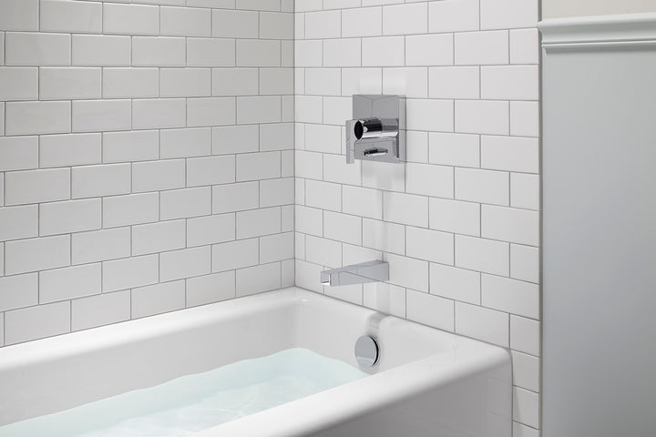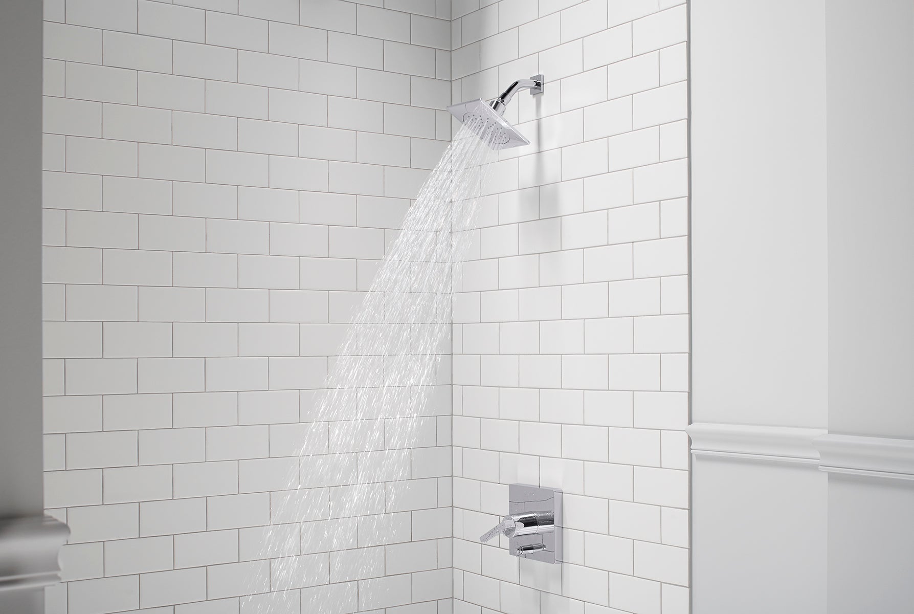 With clean lines and square features, the contemporary Honesty® faucet collection draws inspiration from modern European design. This bath and shower valve trim includes a lever handle and push-button diverter as well as a single-function showerhead with Katalyst® air-induction technology, which maximizes the air/water mix for a powerful, even flow. Pair this trim with a Rite-Temp® pressure-balancing valve with push-button diverter, which maintains your desired water temperature during pressure fluctuations.
