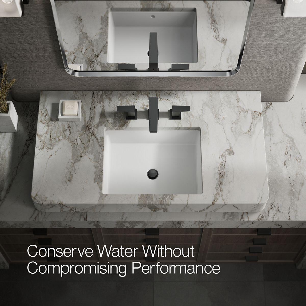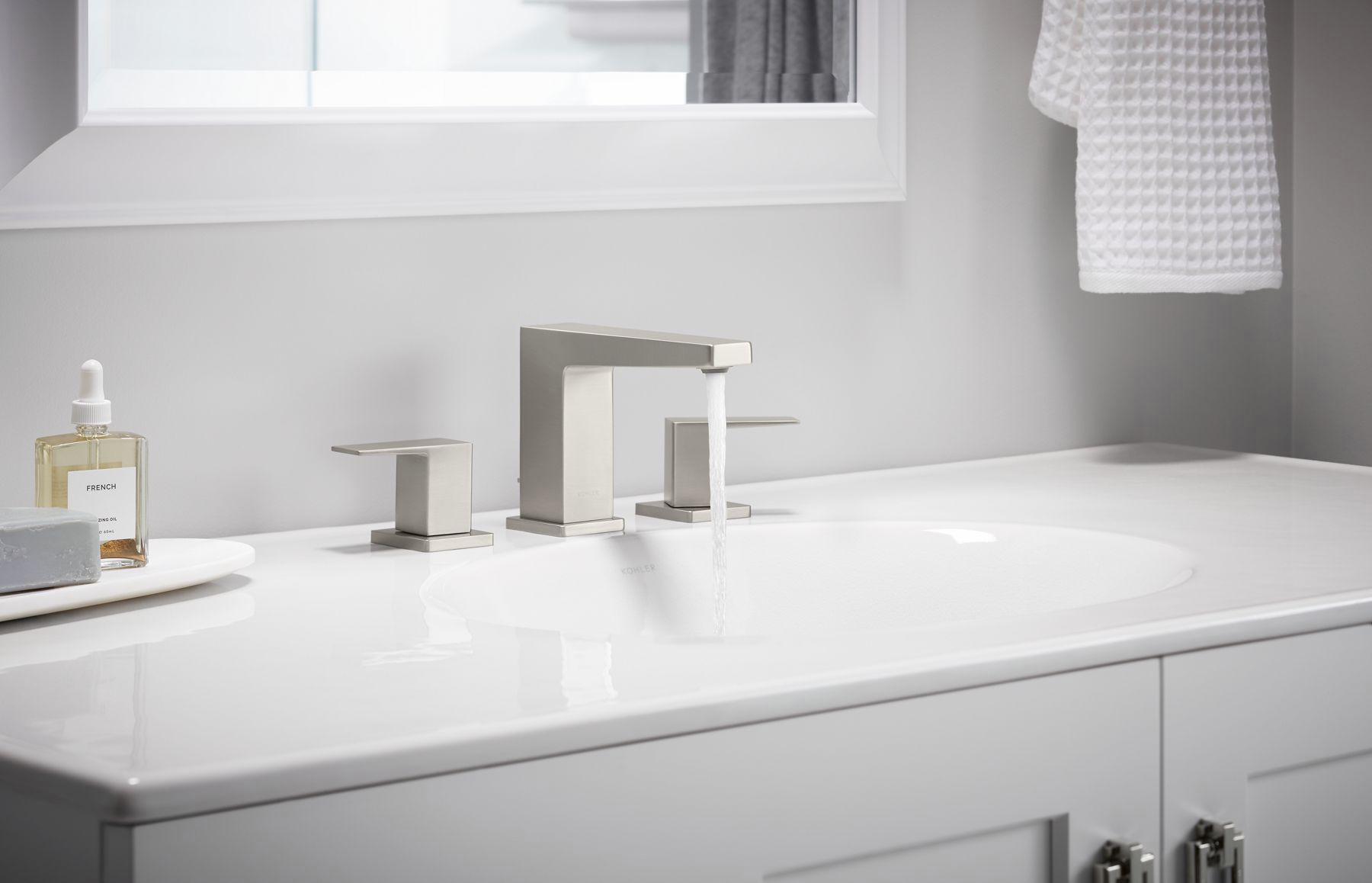 With clean lines and square features, the contemporary Honesty widespread faucet draws inspiration from modern European design. Its sleek look helps create a clutter-free, easy-to-clean bathroom atmosphere.