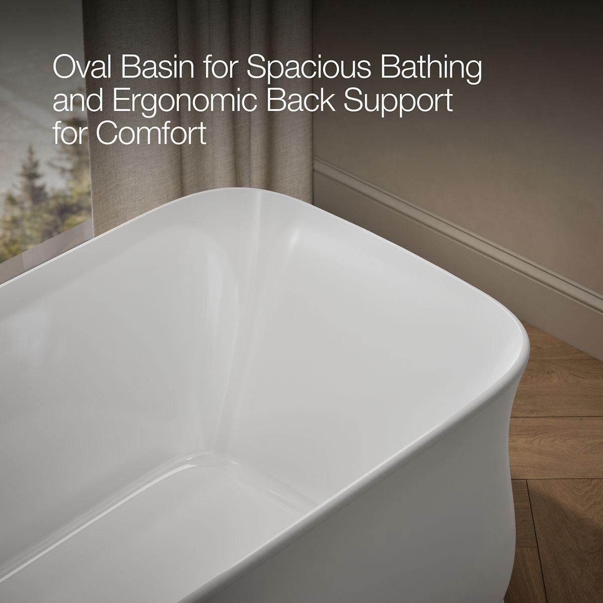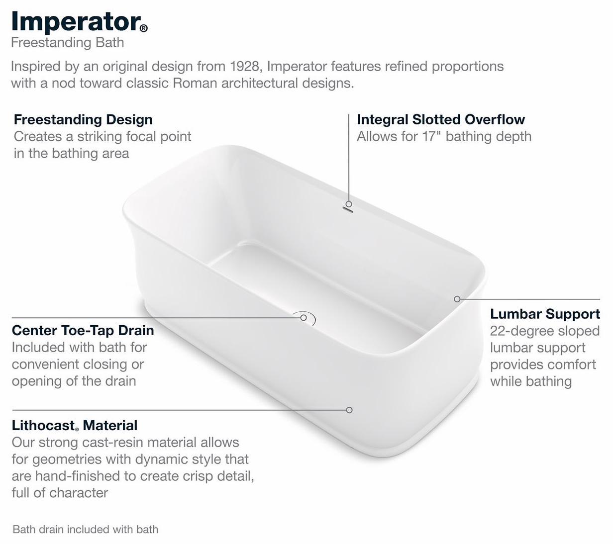 Inspired by an original design from 1928, the Imperator features refined proportions with a nod toward classic Roman architectural styles. This Imperator freestanding bath offers gracefully sculpted curves that cradle your body as you settle in for a deep, restorative soak. KOHLER Lithocast cast resin material allows for geometries with dynamic style and crisp, hand-finished detail rich with character. KOHLER Lithocast Gloss cast resin is lightweight and easy to clean, with a high-gloss finish.