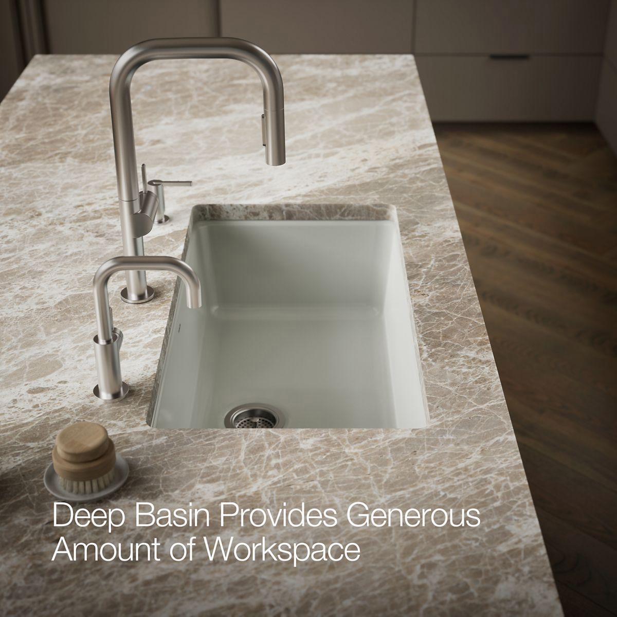 The Iron/Tones sink offers a simple design that is equally at home in modern or traditional kitchens. The single wide basin offers generous space for large cookware. Crafted from enameled cast iron, this sink resists chipping, cracking, and burning for years of beauty and reliable performance.