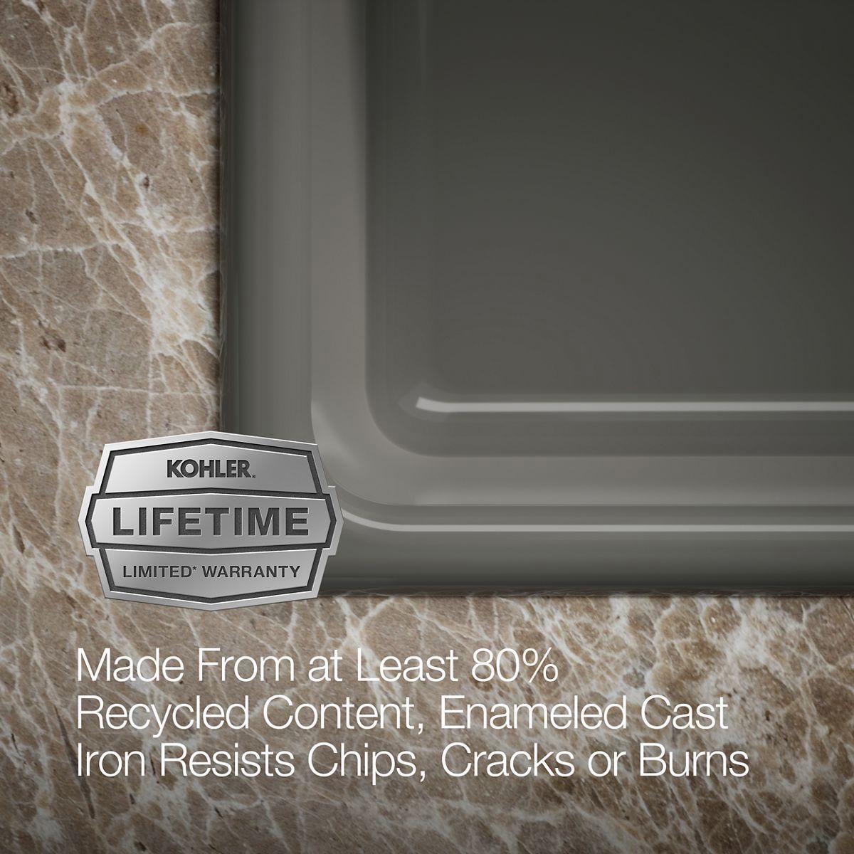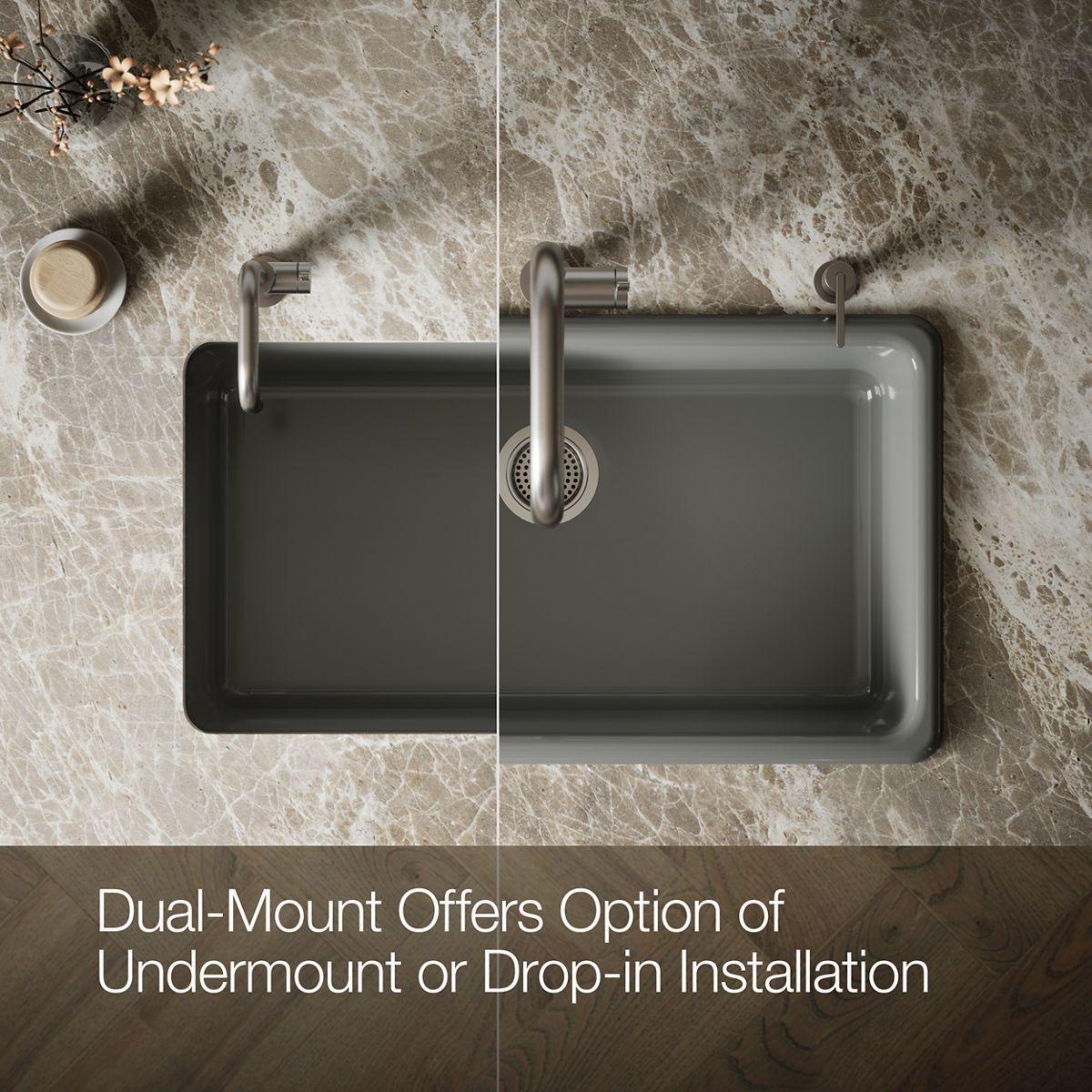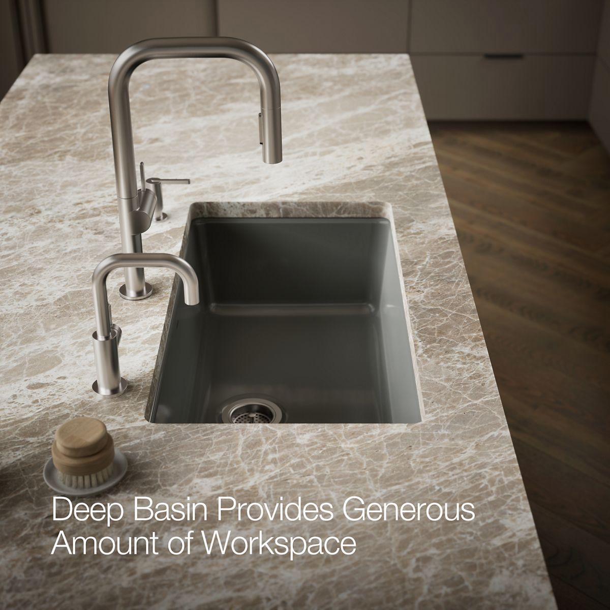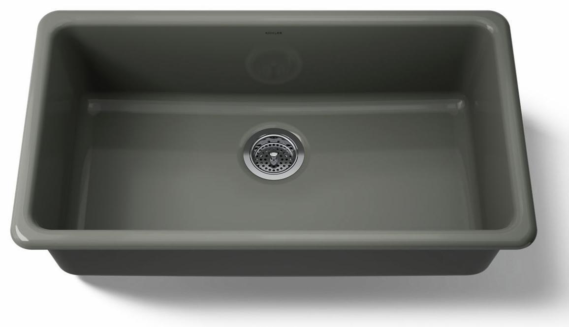 The Iron/Tones sink offers a simple design that is equally at home in modern or traditional kitchens. The single wide basin offers generous space for large cookware. Crafted from enameled cast iron, this sink resists chipping, cracking, and burning for years of beauty and reliable performance.