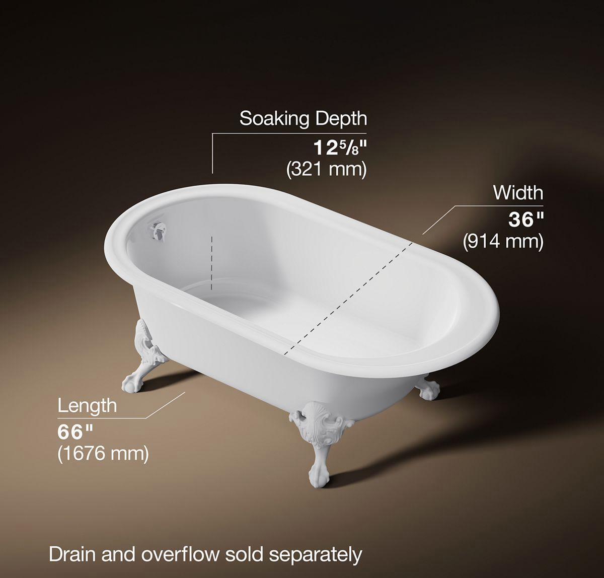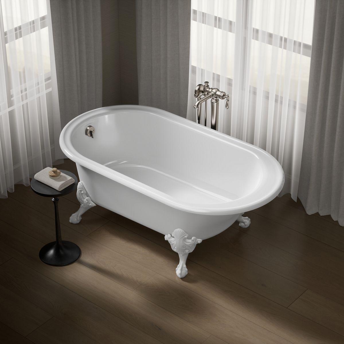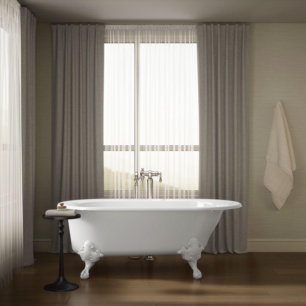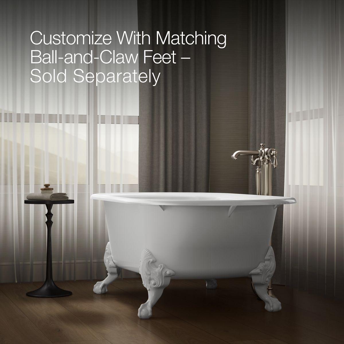 This freestanding cast iron bath features ornate ball-and-claw feet for an antique-inspired look, enhanced by the modern comforts of built-in back support and a Safeguard slip-resistant surface. The classic curves of the Iron Works bath make it the perfect addition to traditional or Victorian-style bathing areas. The exterior ground coat surface is minimally enhanced and painted to capture as much of the raw elements of the cast iron material.
