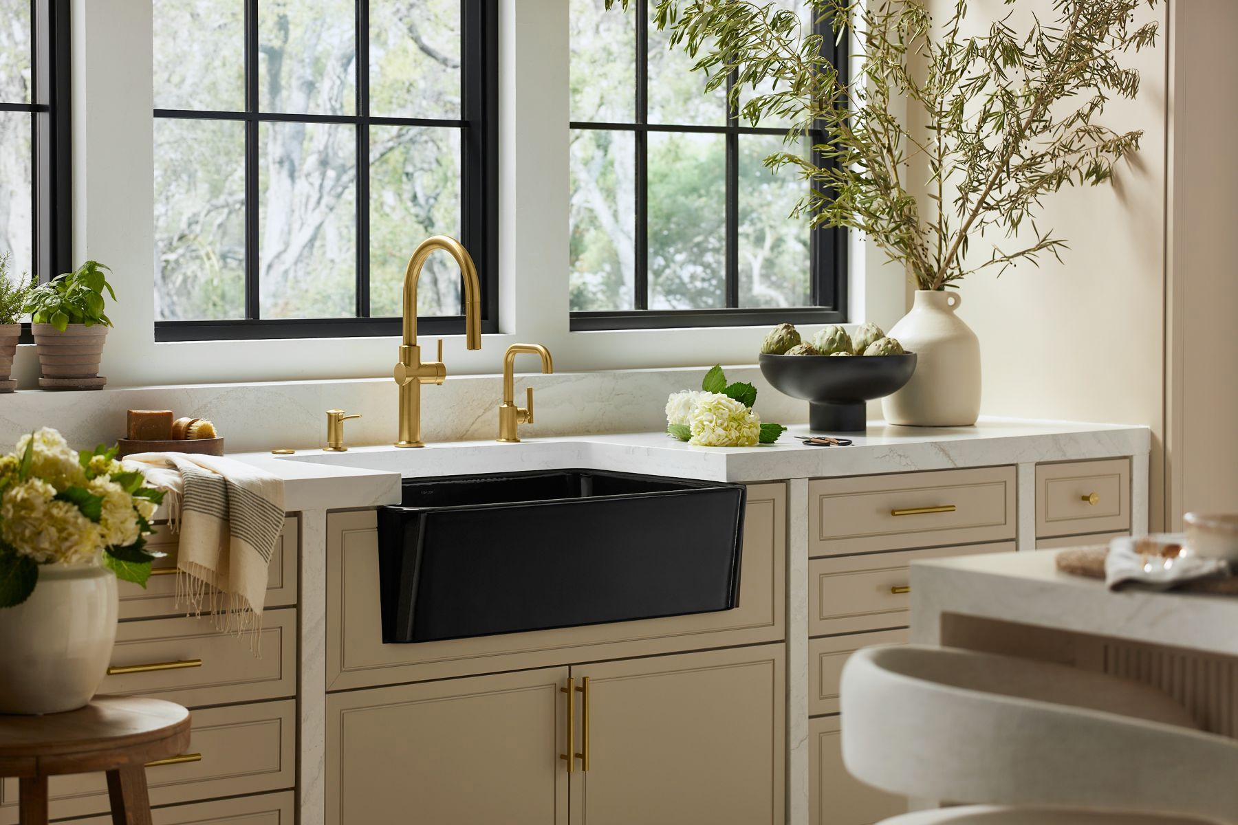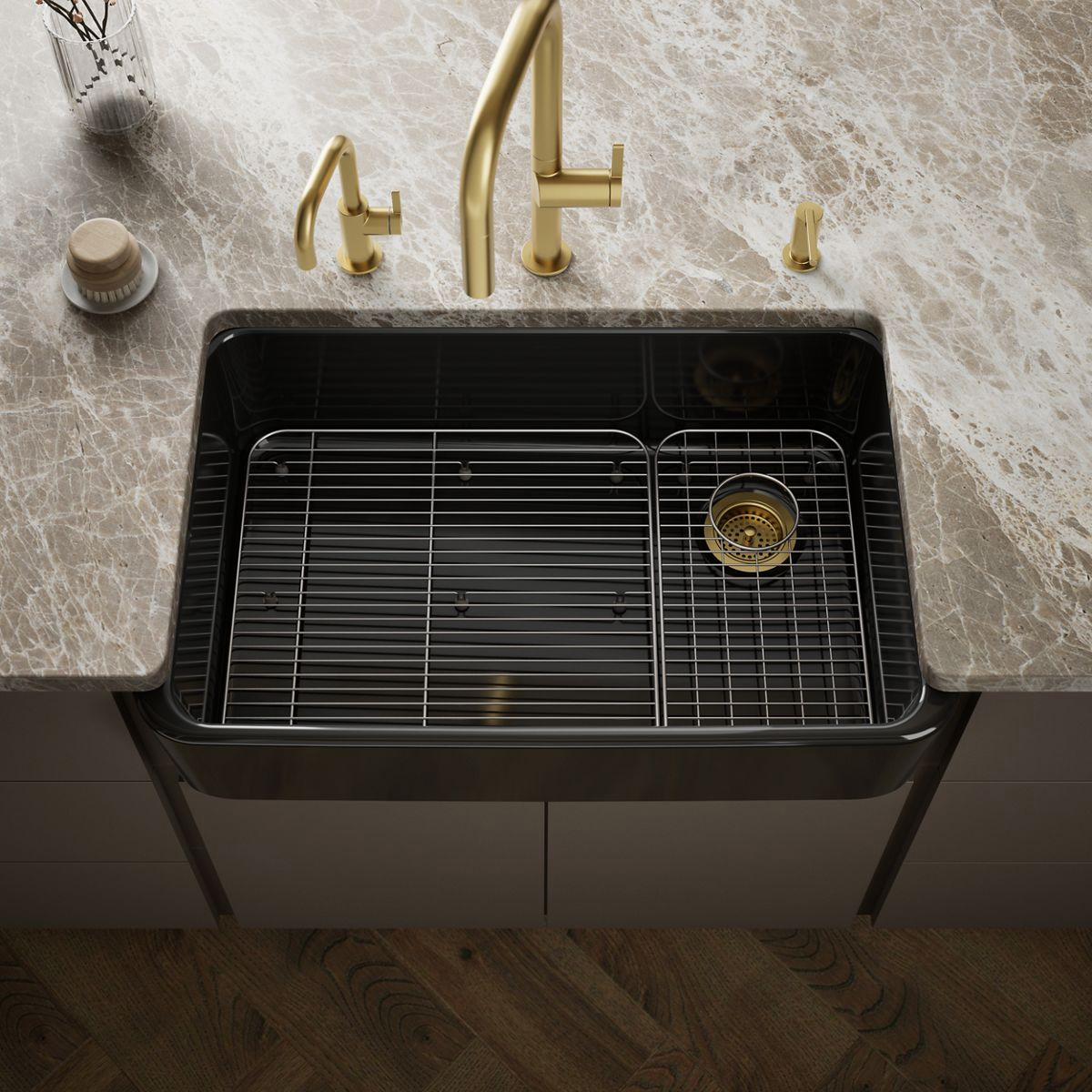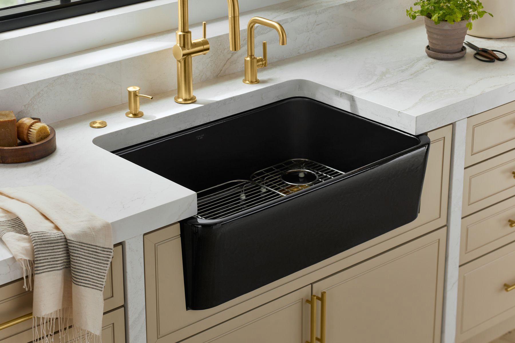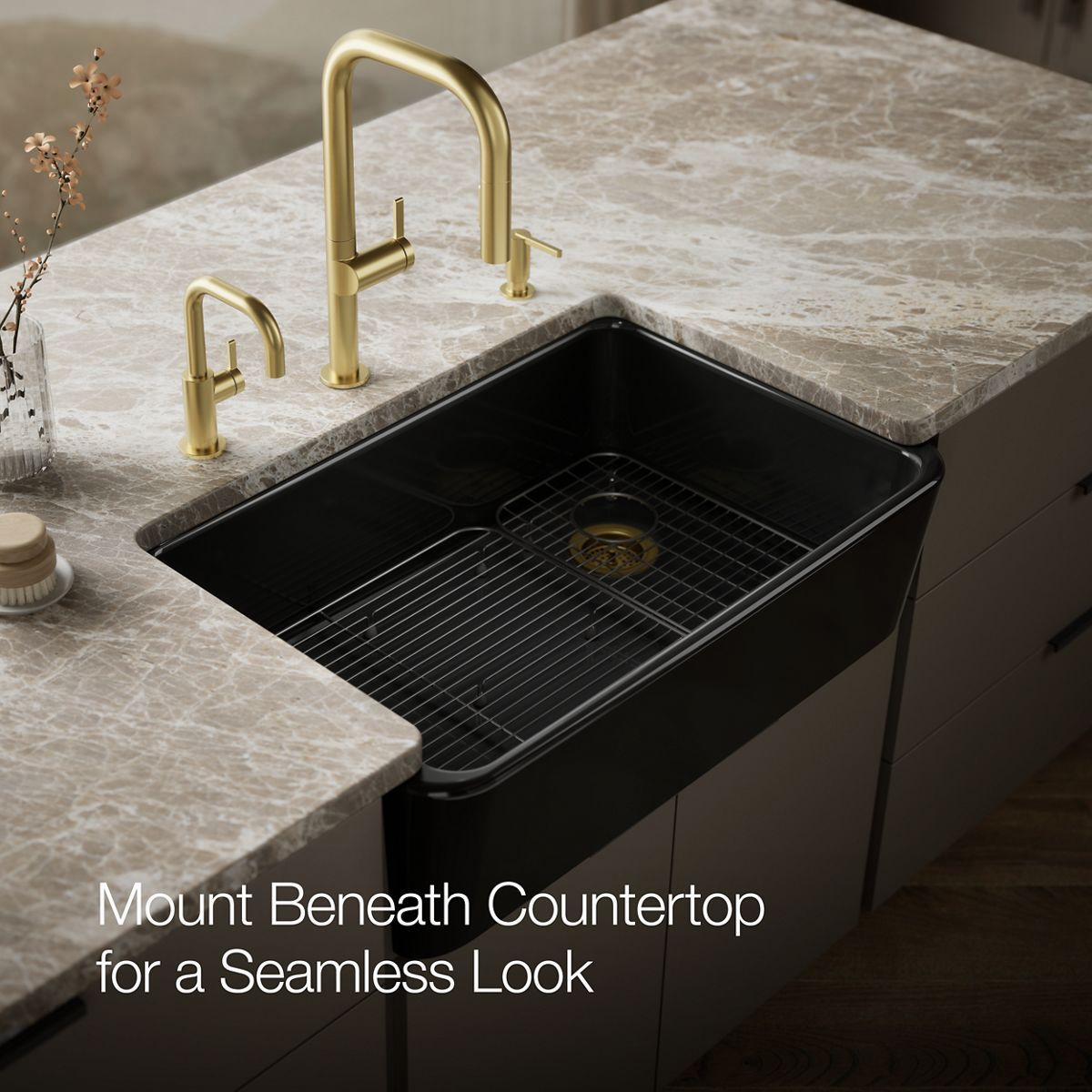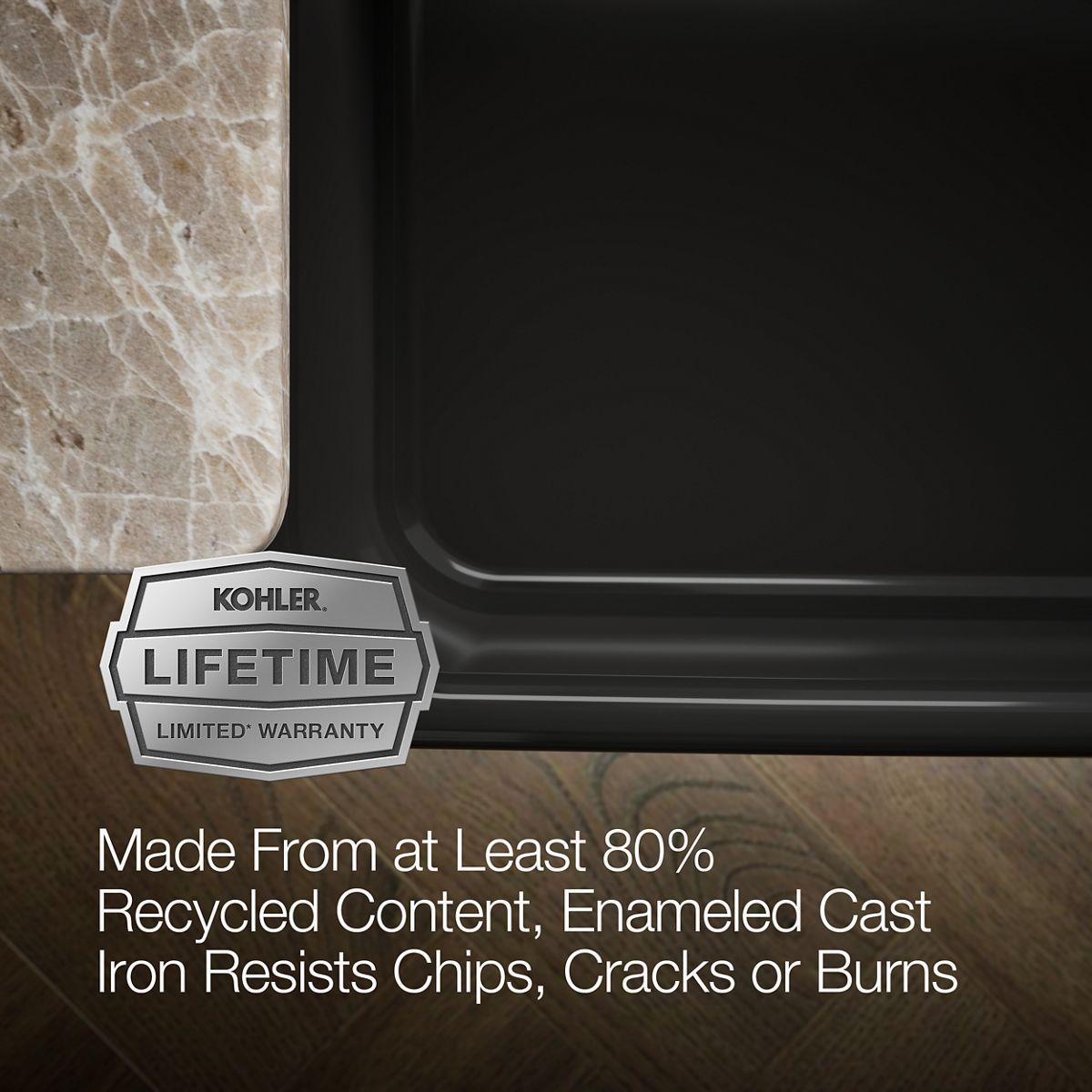 The Ironridge farmhouse kitchen sink features a sleek apron that brings a modern, clean-line aesthetic that will complement any kitchen space from farmhouse-traditional to contemporary. A large, single bowl accommodates large pots and pans, while the sloped bottom helps with draining and cleanup. Crafted from enameled cast iron, this sink resists chipping, cracking, or burning for years of beauty and reliable performance. A standard apron front makes it easy to install on 36 apron-front cabinetry. The Self-Trimming design requires only a simple rough cut, overlapping the cabinet face for beautiful results.