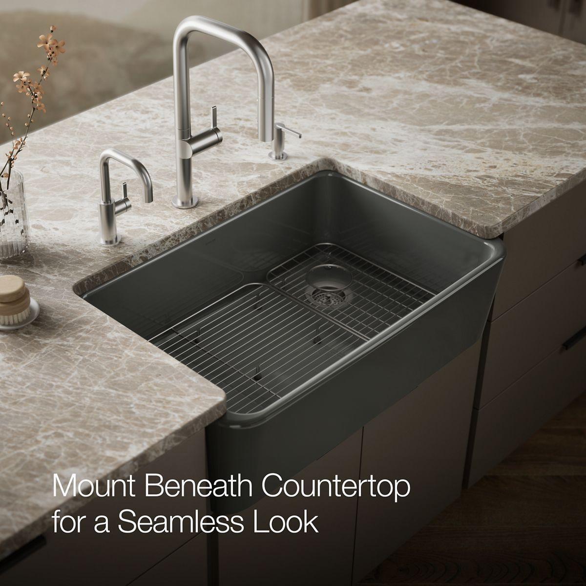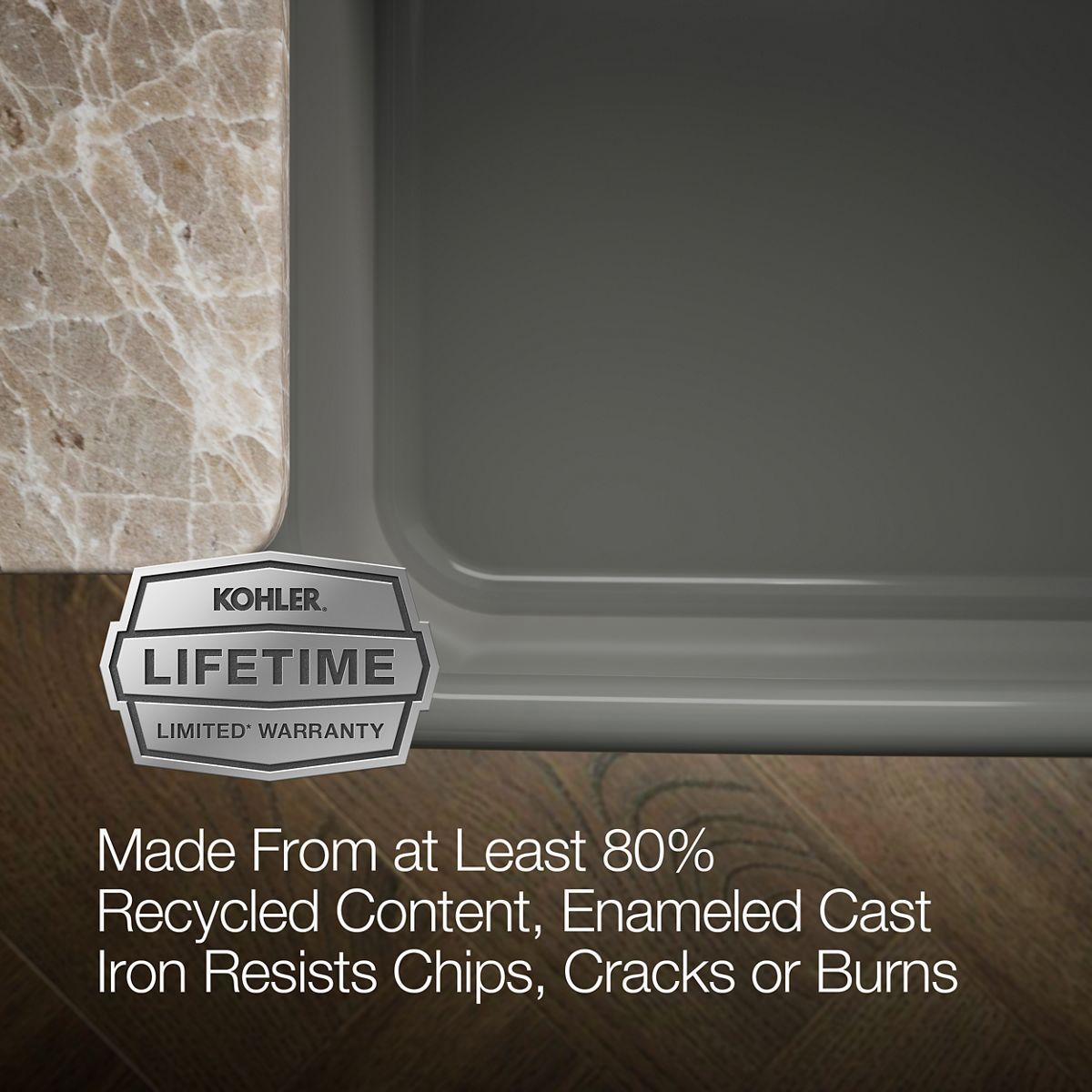 The Ironridge farmhouse kitchen sink features a sleek apron that brings a modern, clean-line aesthetic that will complement any kitchen space from farmhouse-traditional to contemporary. A large, single bowl accommodates large pots and pans, while the sloped bottom helps with draining and cleanup. Crafted from enameled cast iron, this sink resists chipping, cracking, or burning for years of beauty and reliable performance. A standard apron front makes it easy to install on 36" apron-front cabinetry. The Self-Trimming design requires only a simple rough cut, overlapping the cabinet face for beautiful results.