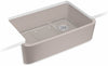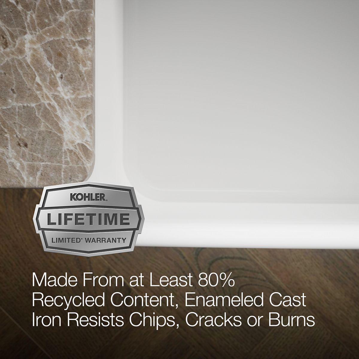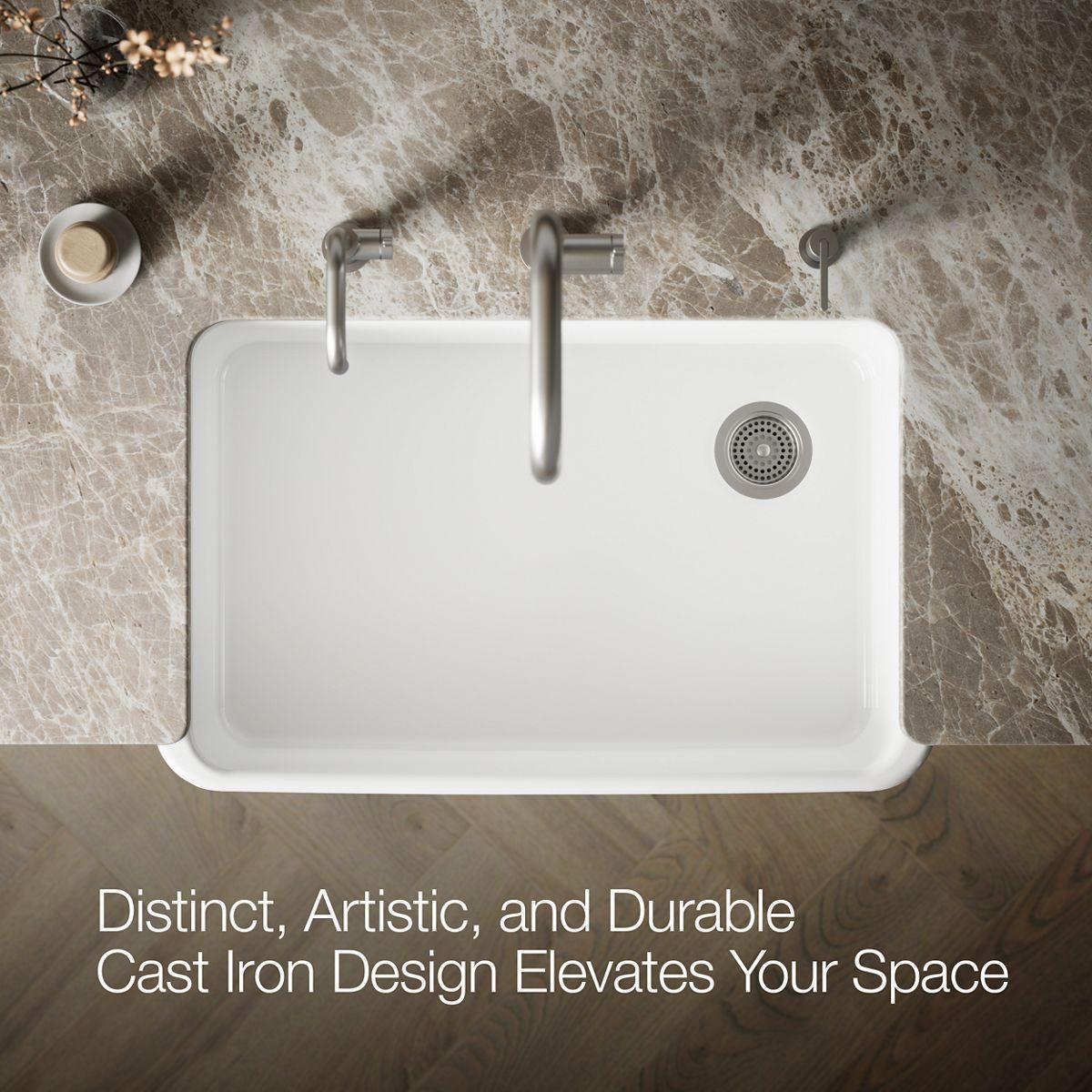 The Ironridge farmhouse kitchen sink features a sleek apron that brings a modern, clean-line aesthetic that will complement any kitchen space from farmhouse-traditional to contemporary. A large, single bowl accommodates large pots and pans, while the sloped bottom helps with draining and cleanup. Crafted from enameled cast iron, this sink resists chipping, cracking, or burning for years of beauty and reliable performance. A standard apron front makes it easy to install on 36" apron-front cabinetry. The Self-Trimming® design requires only a simple rough cut, overlapping the cabinet face for beautiful results.