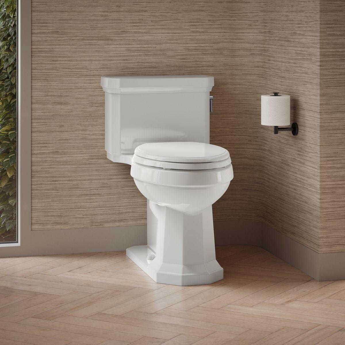 Capture the classic look of the 1930s with the Kathryn collection's angular lines and molded edges. This one-piece toilet features a convenient chair-like height and compact elongated bowl for comfortable use, as well as a concealed trapway for sleek looks and simple cleaning. A 1.28-gallon flush provides significant water savings of up to 16,500 gallons per year, compared to a 3.5-gallon toilet, without sacrificing performance. This tank features innovative AquaPiston technology, a patented flush engine that delivers a fast, powerful, and virtually plug-free flush.