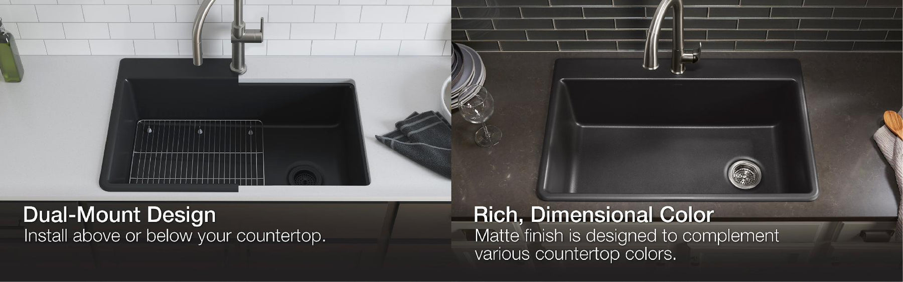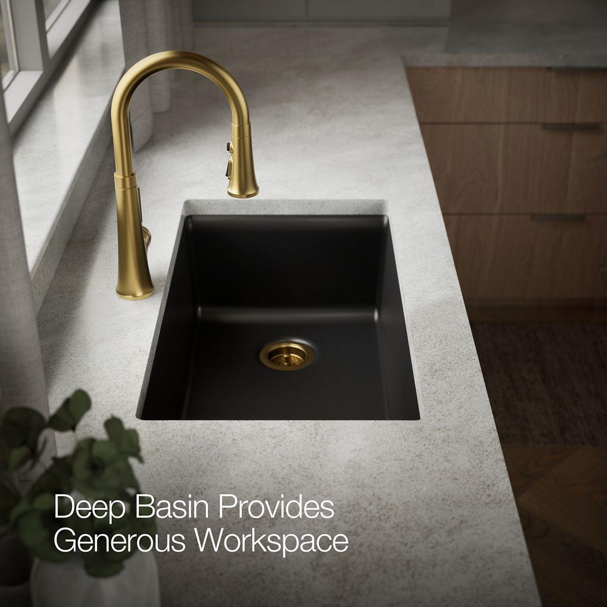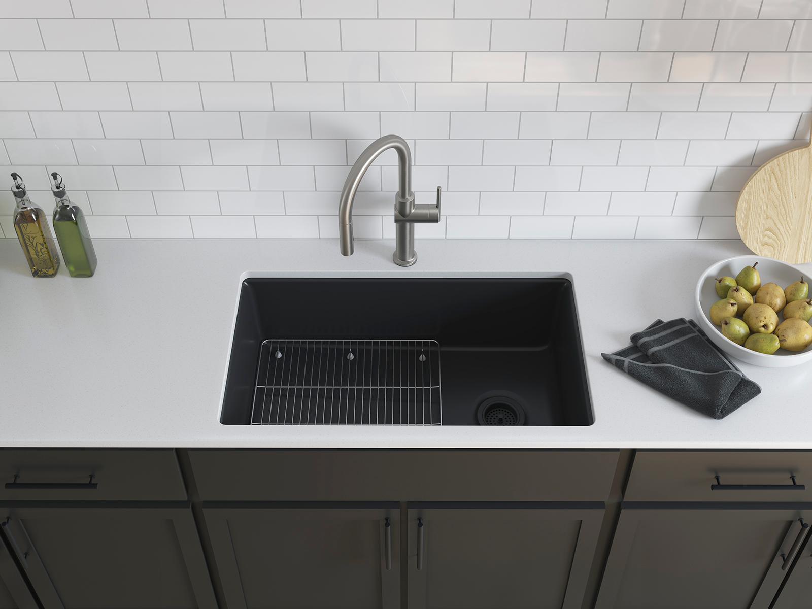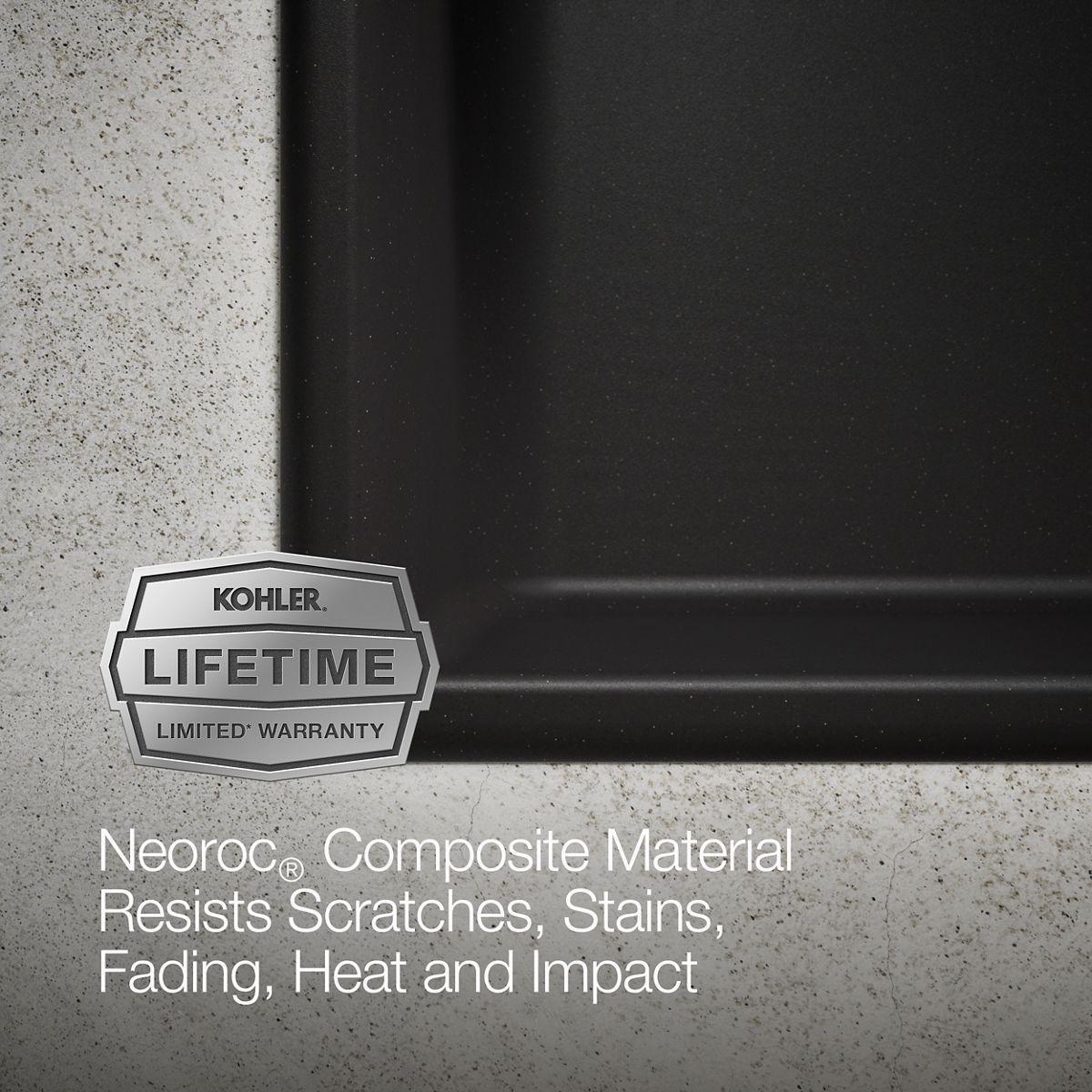 The Kennon single-bowl sink features an elegant, wave-like curve that complements any kitchen decor. The Kennon sink is made of KOHLER Neoroc, a matte-finish composite material designed for extreme durability and unmatched beauty. Richly colored to complement any countertop, Neoroc resists scratches, stains, and fading and is highly heat- and impact-resistant.