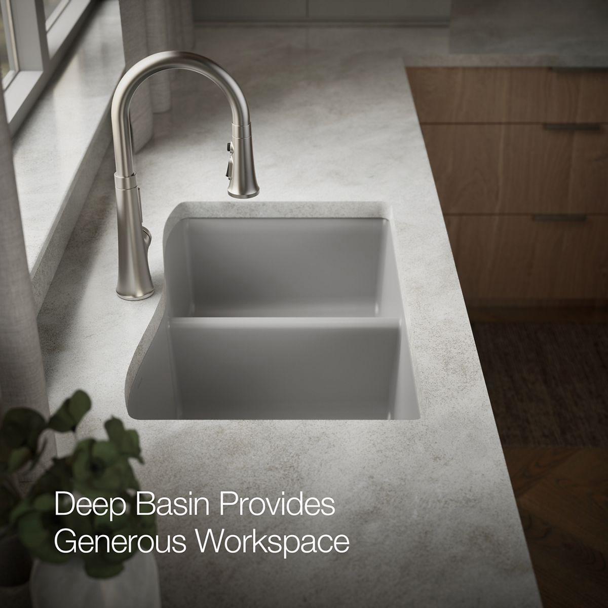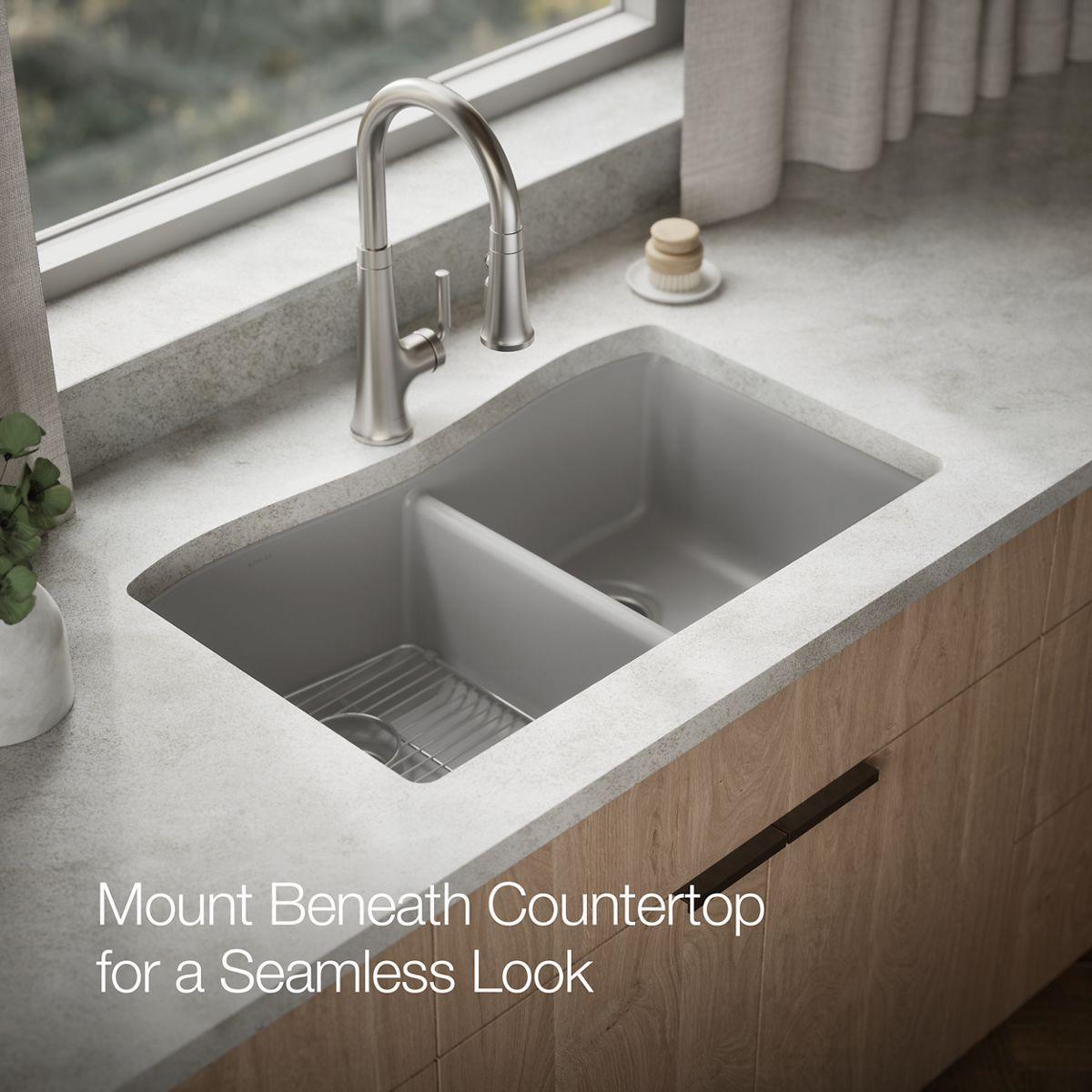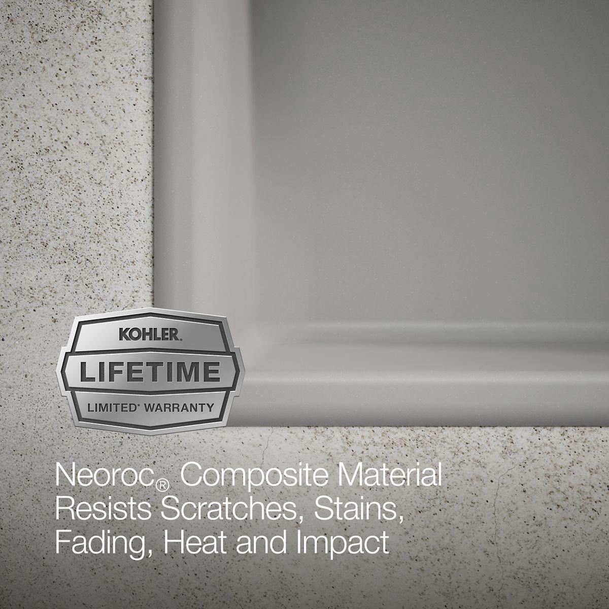 The Kennon double-bowl sink features an elegant, wave-like curve that complements any kitchen decor. The Kennon sink is made of KOHLER Neoroc, a matte-finish composite material designed for extreme durability and unmatched beauty. Richly colored to complement any countertop, Neoroc resists scratches, stains, and fading and is highly heat- and impact-resistant.