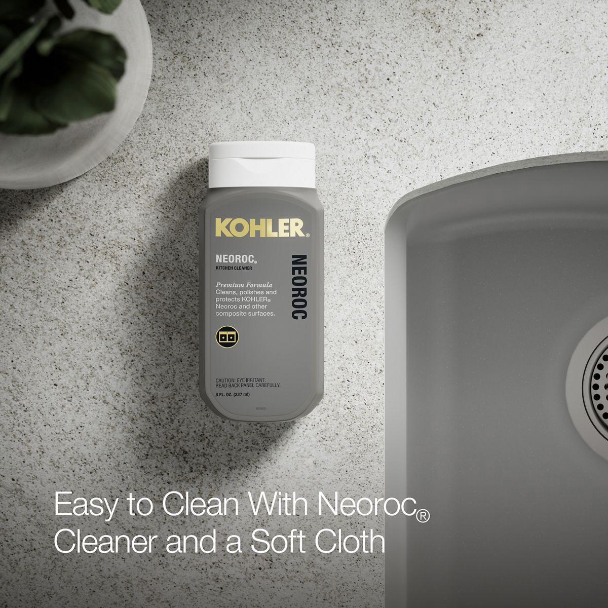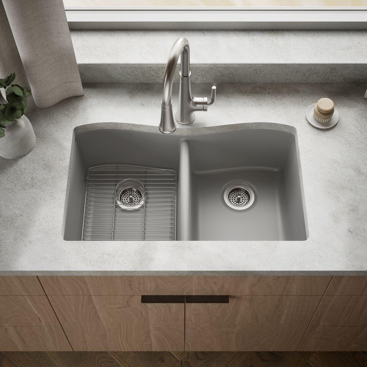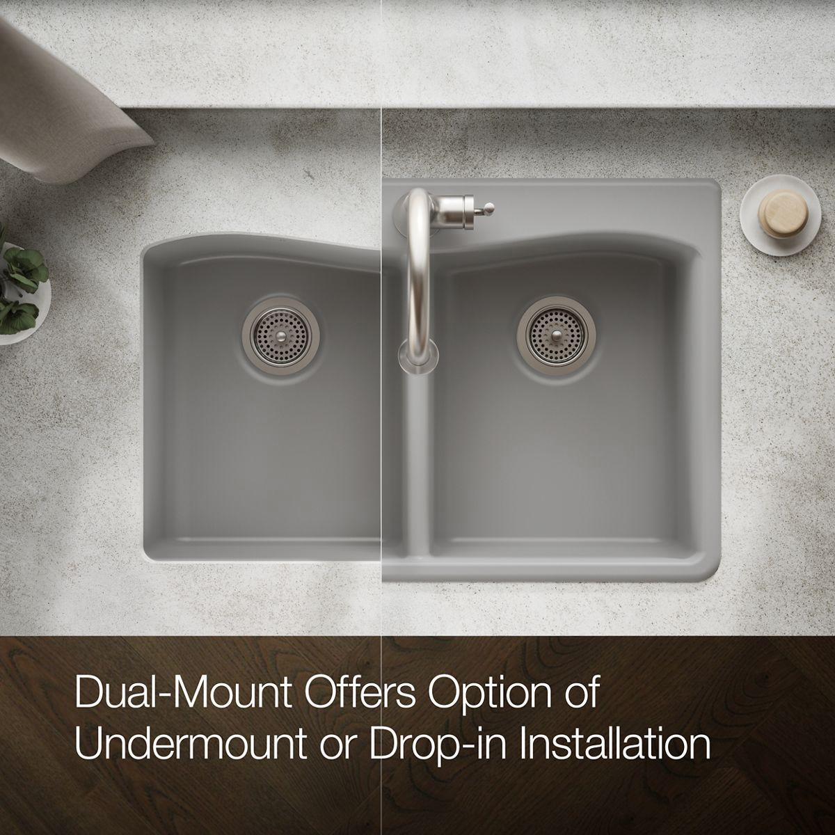 The Kennon double-bowl sink features an elegant, wave-like curve that complements any kitchen decor. The Kennon sink is made of KOHLER Neoroc, a matte-finish composite material designed for extreme durability and unmatched beauty. Richly colored to complement any countertop, Neoroc resists scratches, stains, and fading and is highly heat- and impact-resistant.