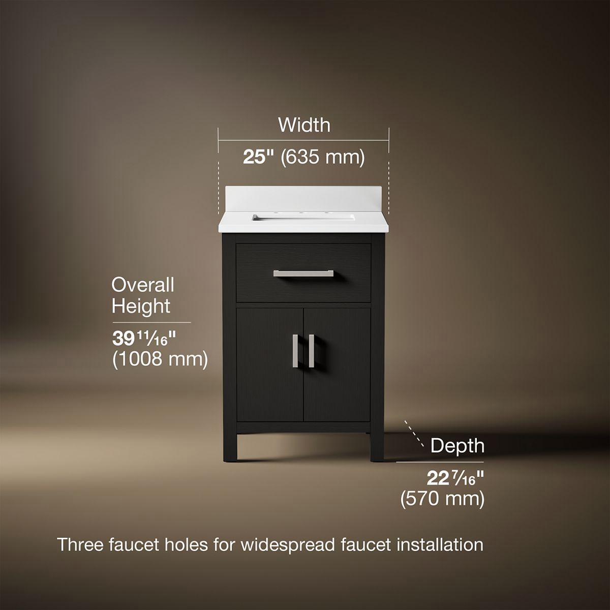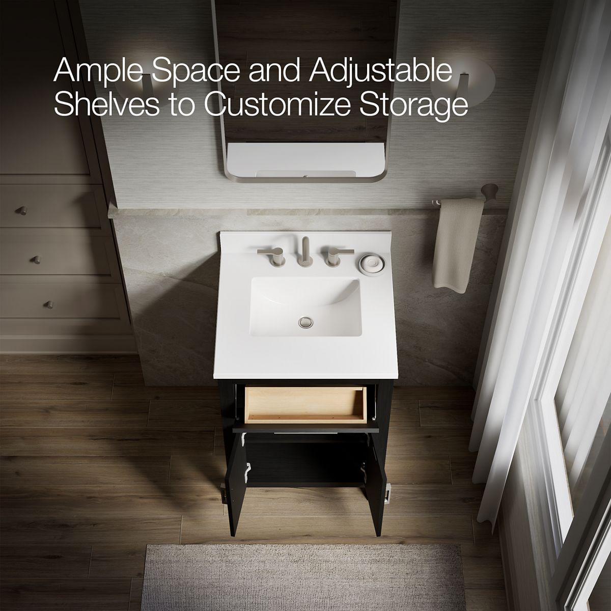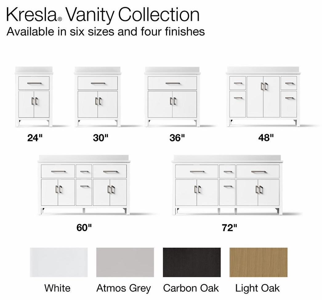 The Kresla vanity collection brings a quiet sophistication into your bathroom space with its with clean, architectural lines and range of finishes, and with its roomy interior you'll find ample storage space to keep your bathroom organized and clutter-free. The Kresla 24" vanity set includes cabinet, quartz countertop with matching backsplash, sink, and hardware. With KOHLER, it’s easy to find the design solution that’s right for you.