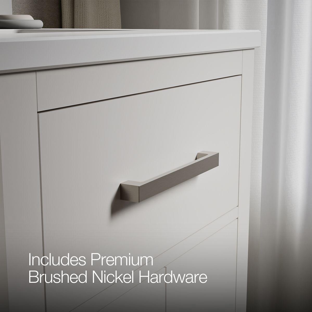 - Brushed Nickel hardware included on White, Atmos Grey, and Carbon Oak vanities, and Matte Black hardware on Light Oak vanities.