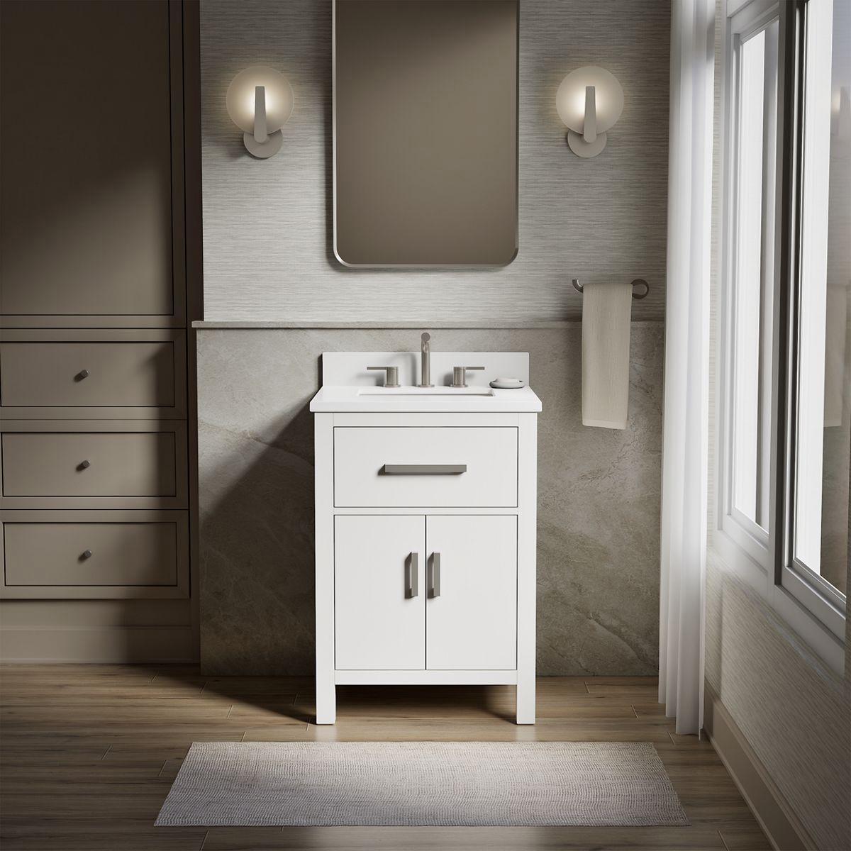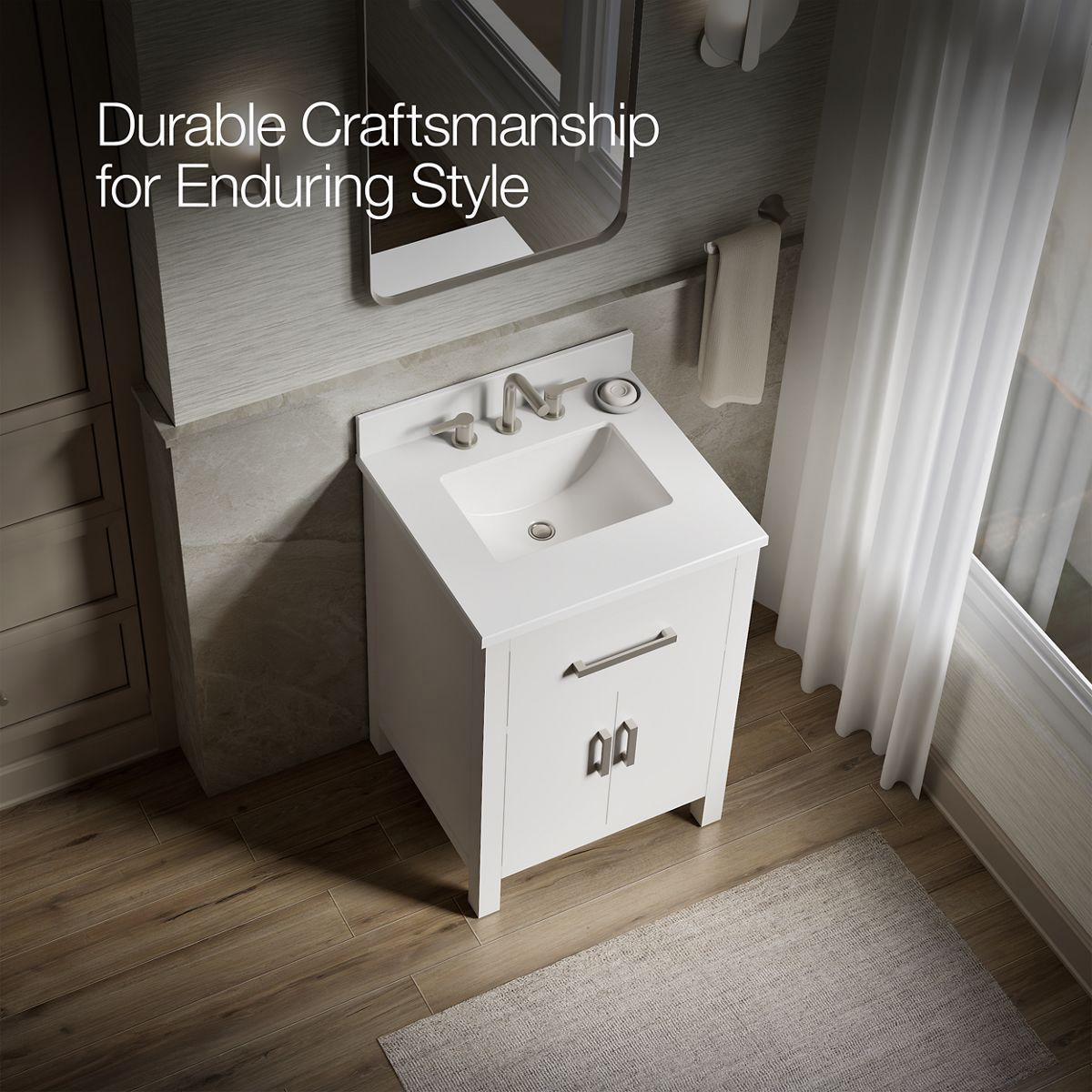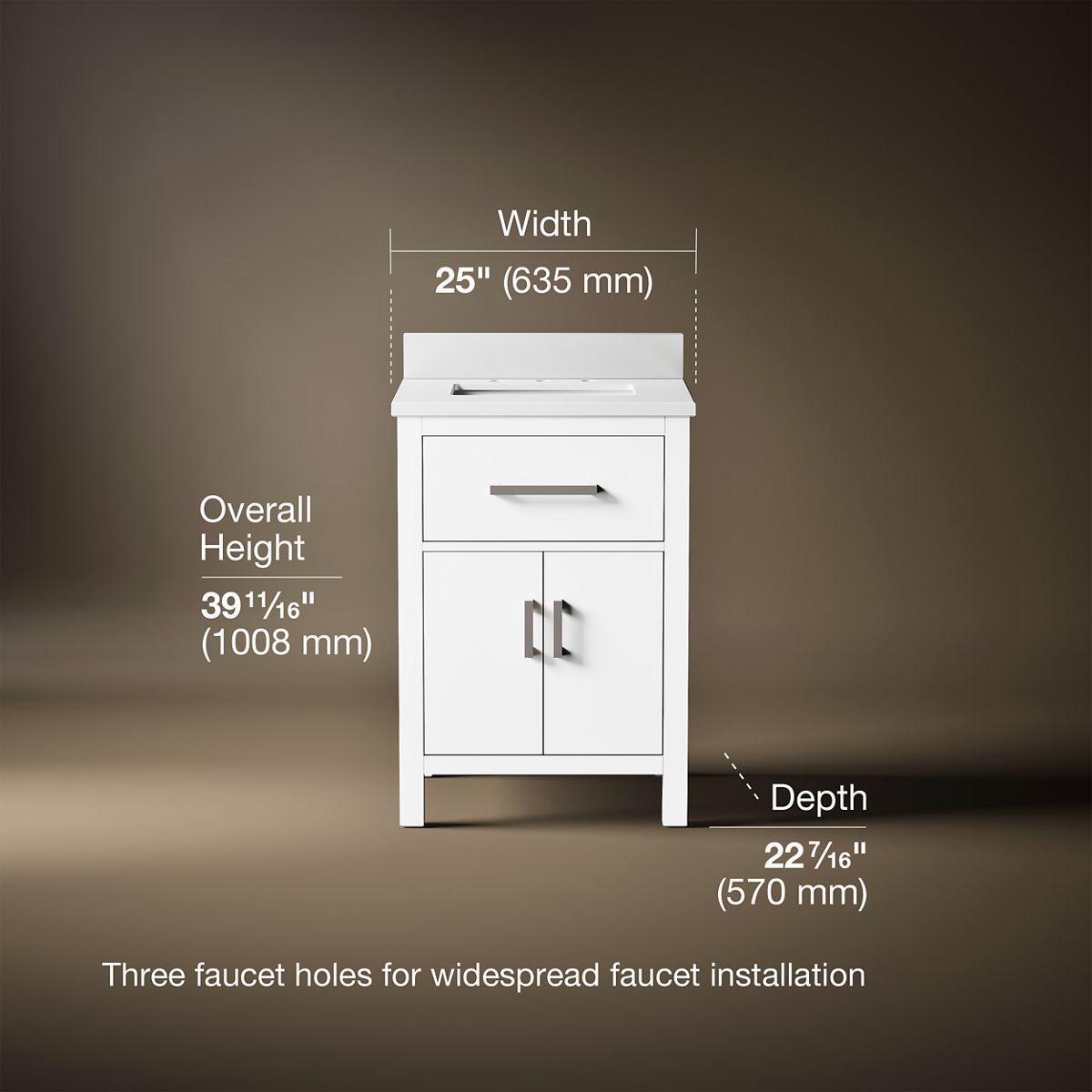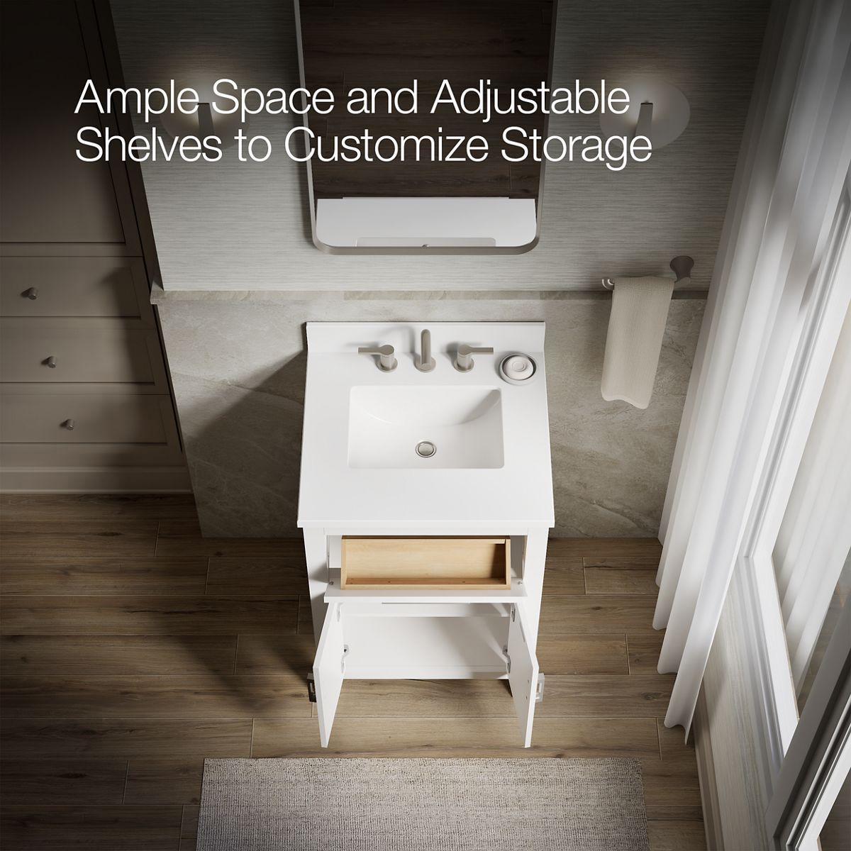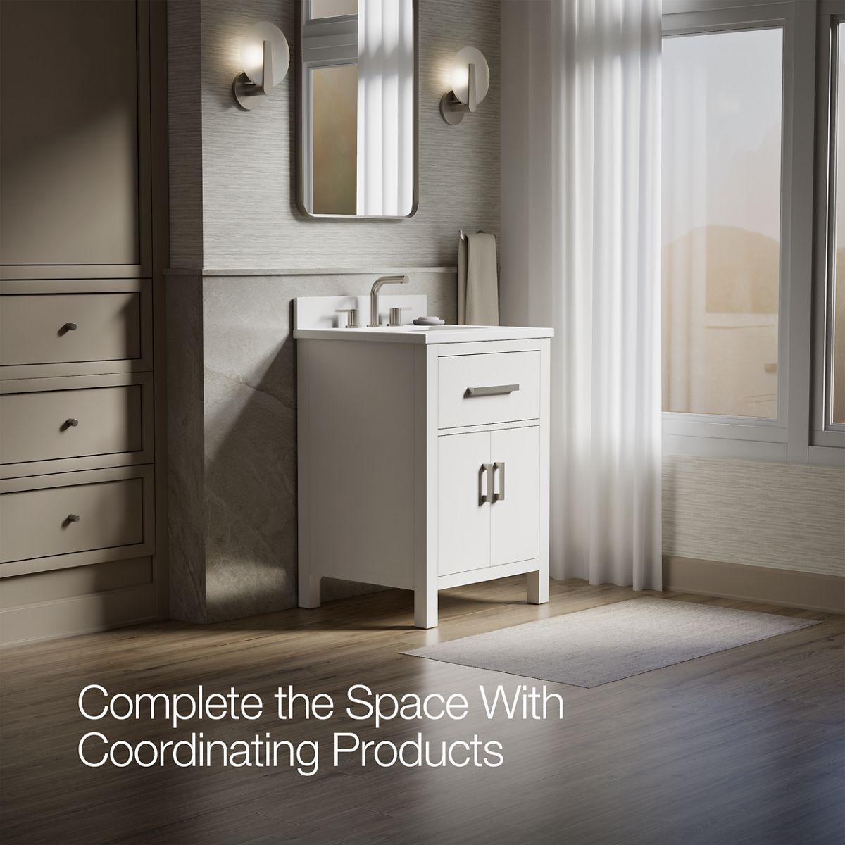 The Kresla vanity collection brings a quiet sophistication into your bathroom space with its with clean, architectural lines and range of finishes, and with its roomy interior you'll find ample storage space to keep your bathroom organized and clutter-free. The Kresla 24" vanity set includes cabinet, quartz countertop with matching backsplash, sink, and hardware. With KOHLER, it’s easy to find the design solution that’s right for you.