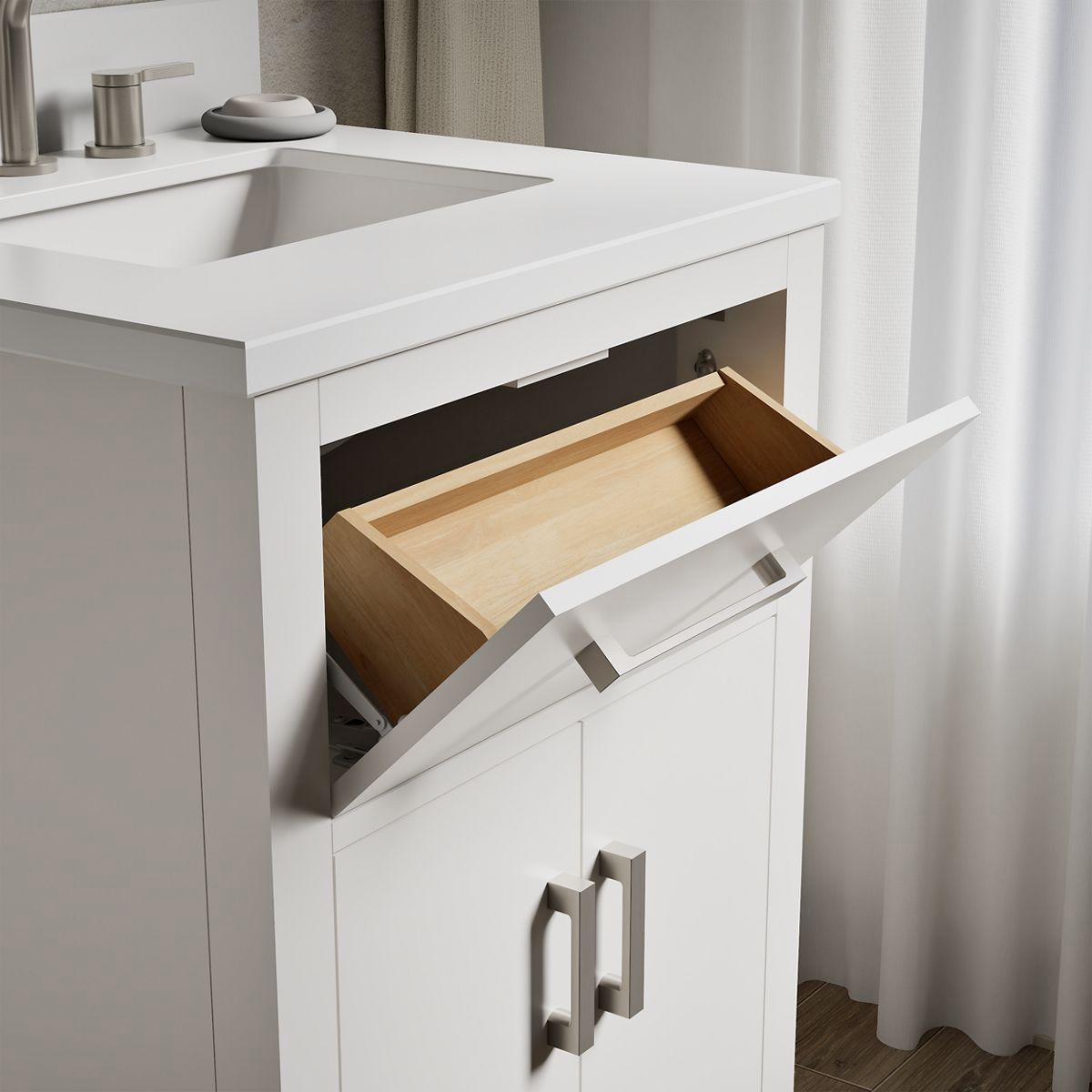 - Pure White quartz vanity top and backsplash add beauty and long-lasting durability