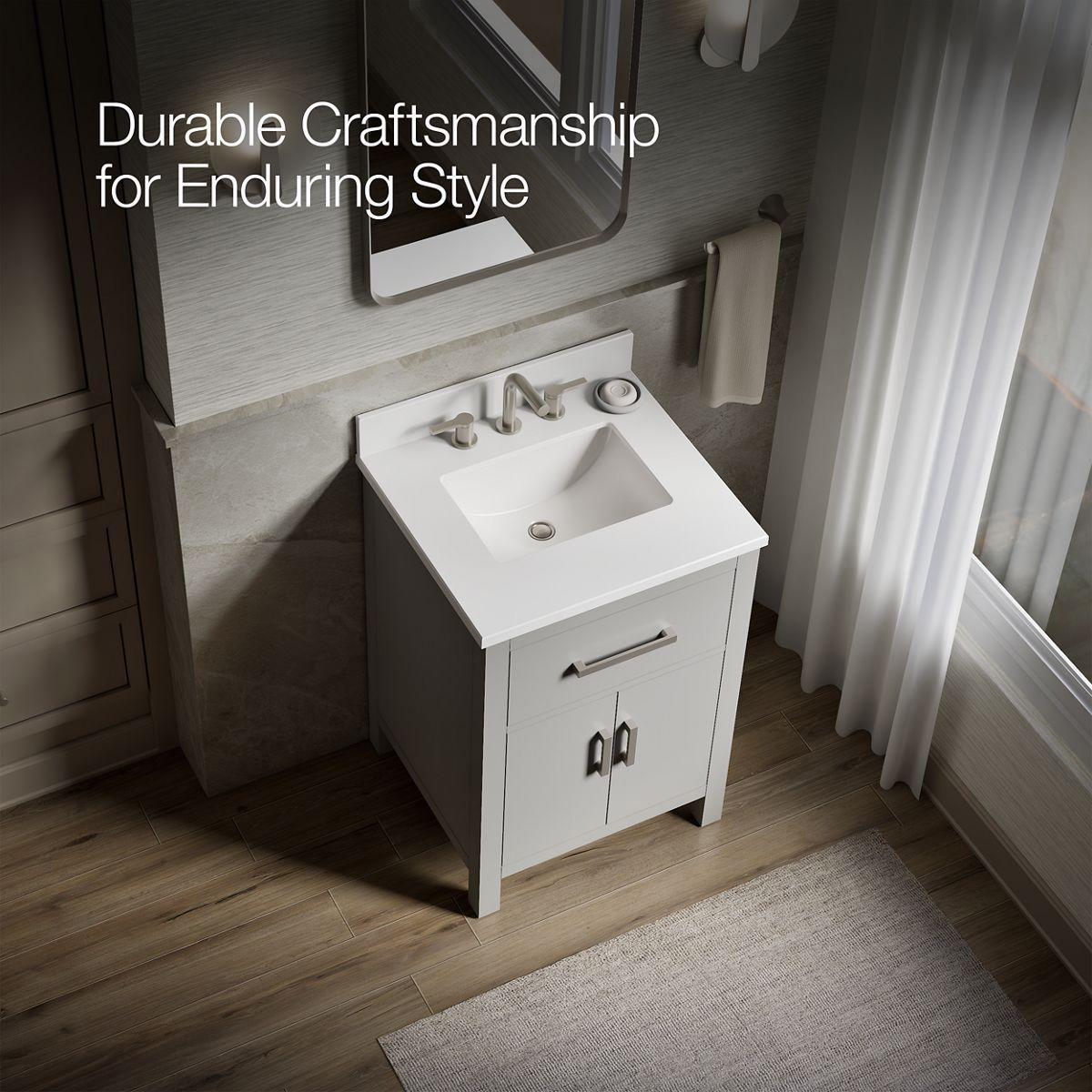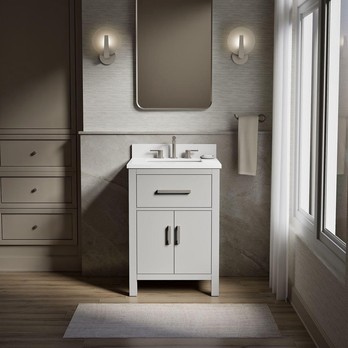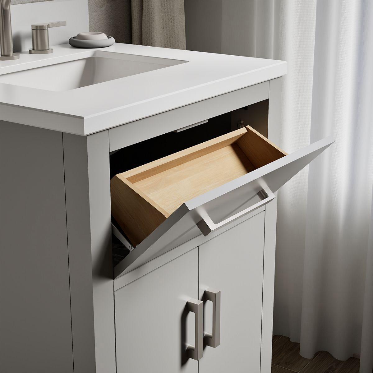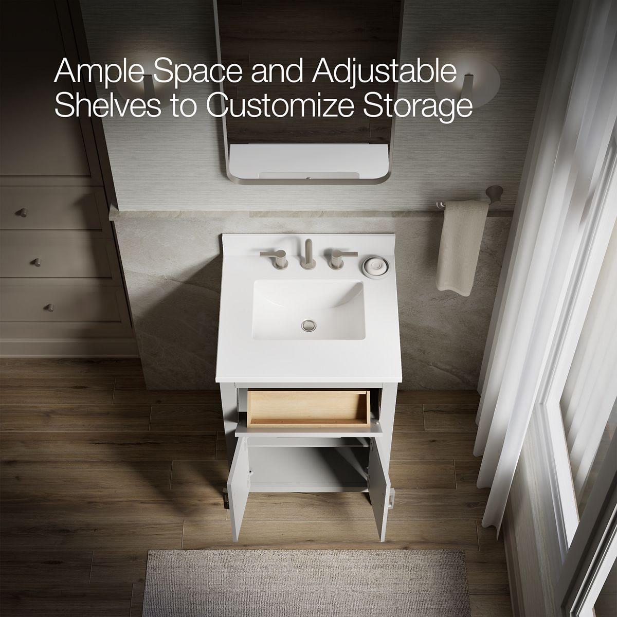 The Kresla vanity collection brings a quiet sophistication into your bathroom space with its with clean, architectural lines and range of finishes, and with its roomy interior you'll find ample storage space to keep your bathroom organized and clutter-free. The Kresla 24" vanity set includes cabinet, quartz countertop with matching backsplash, sink, and hardware. With KOHLER, it’s easy to find the design solution that’s right for you.