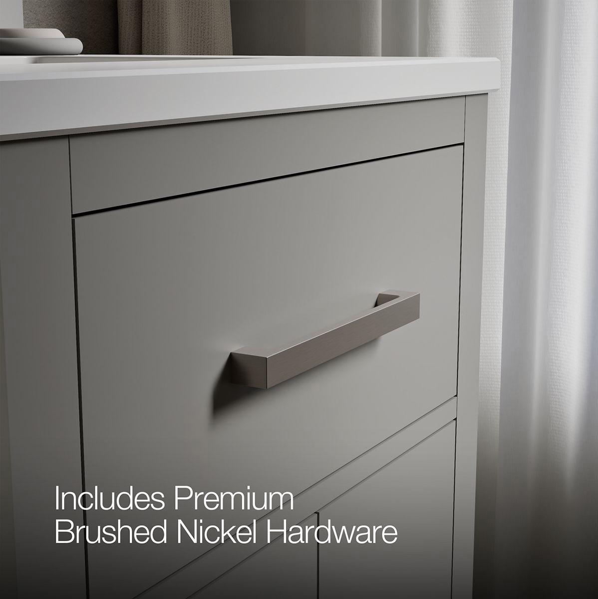 - Brushed Nickel hardware included on White, Atmos Grey, and Black Oak vanities, and Matte Black hardware on Light Oak vanities.