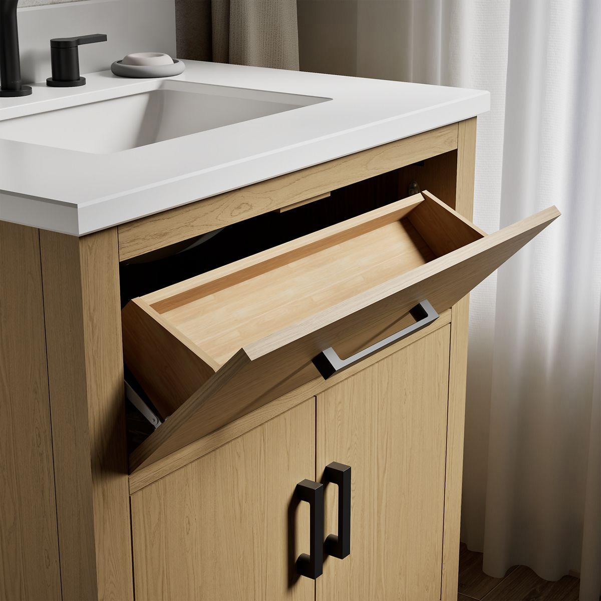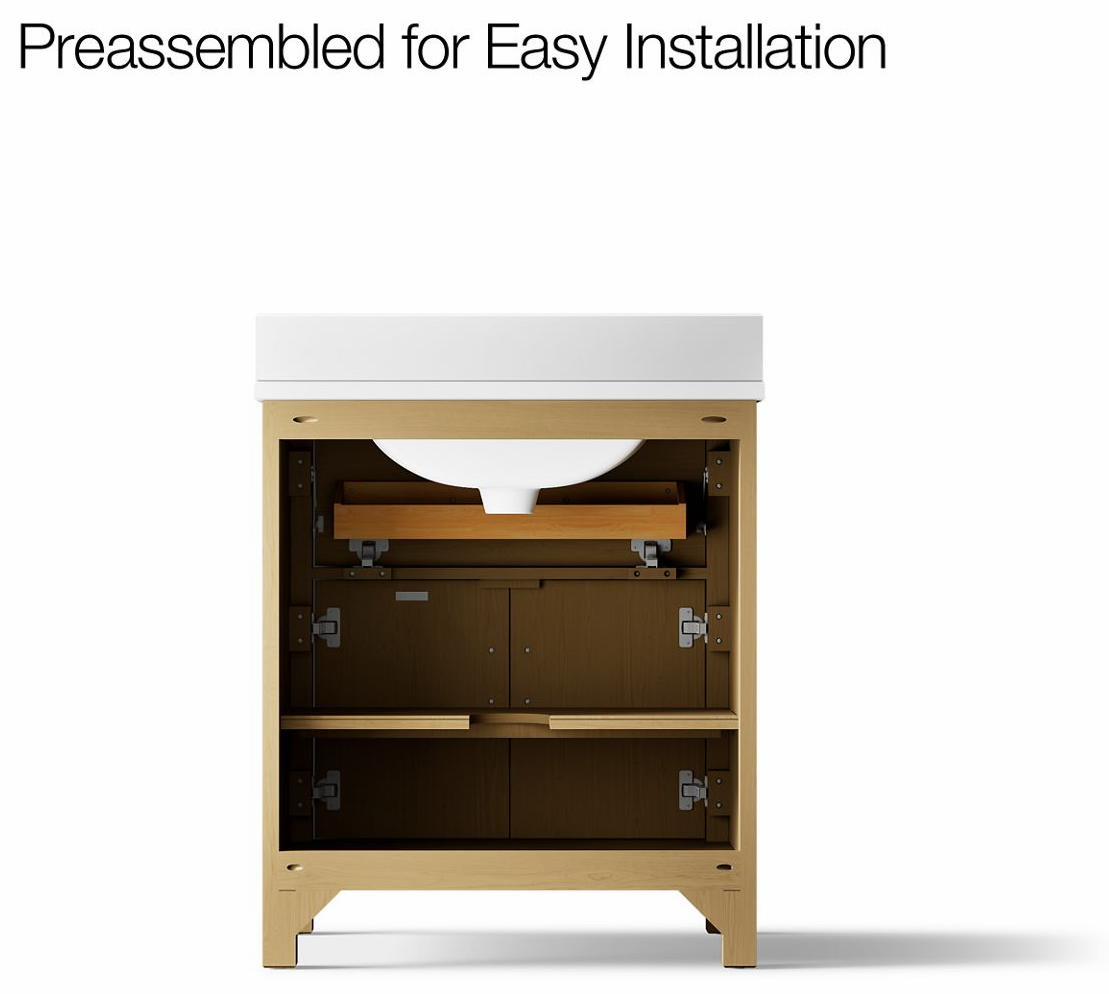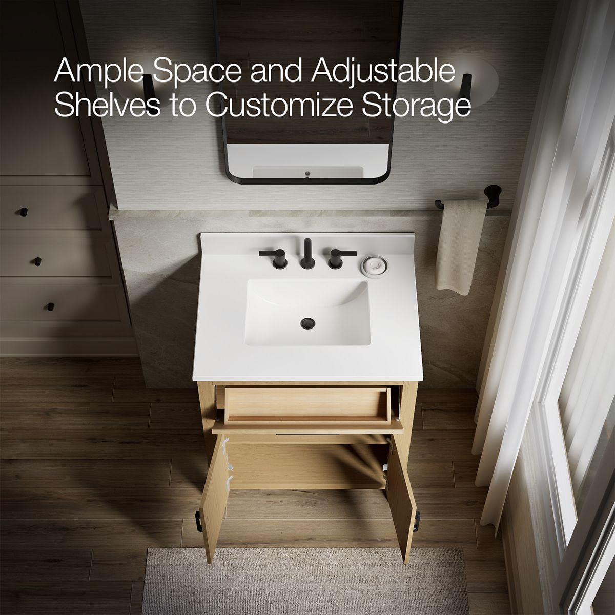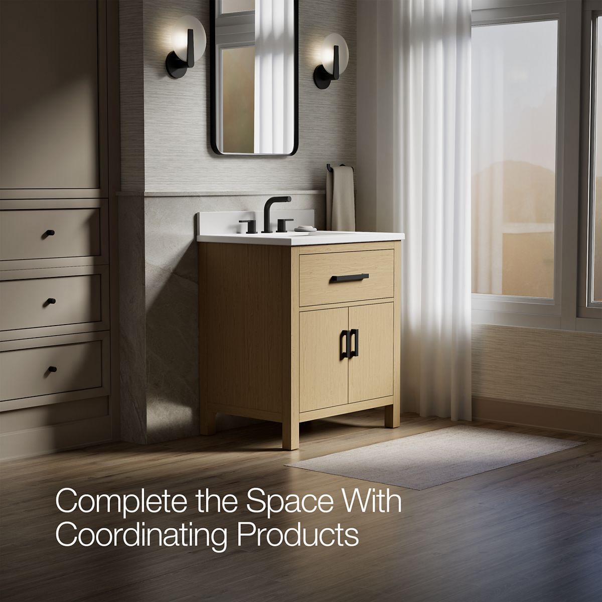 The Kresla vanity collection brings a quiet sophistication into your bathroom space with its with clean, architectural lines and range of finishes, and with its roomy interior, you'll find ample storage space to keep your bathroom organized and clutter-free. The Kresla 30" vanity set includes cabinet, quartz countertop with matching backsplash, sink, and hardware. With KOHLER®, it’s easy to find the design solution that’s right for you.