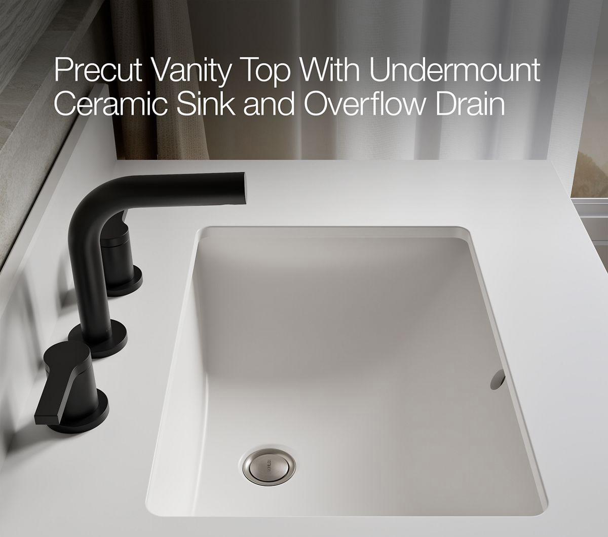 - Set includes cabinet, precut quartz vanity top, backsplash, sink, cabinet hardware