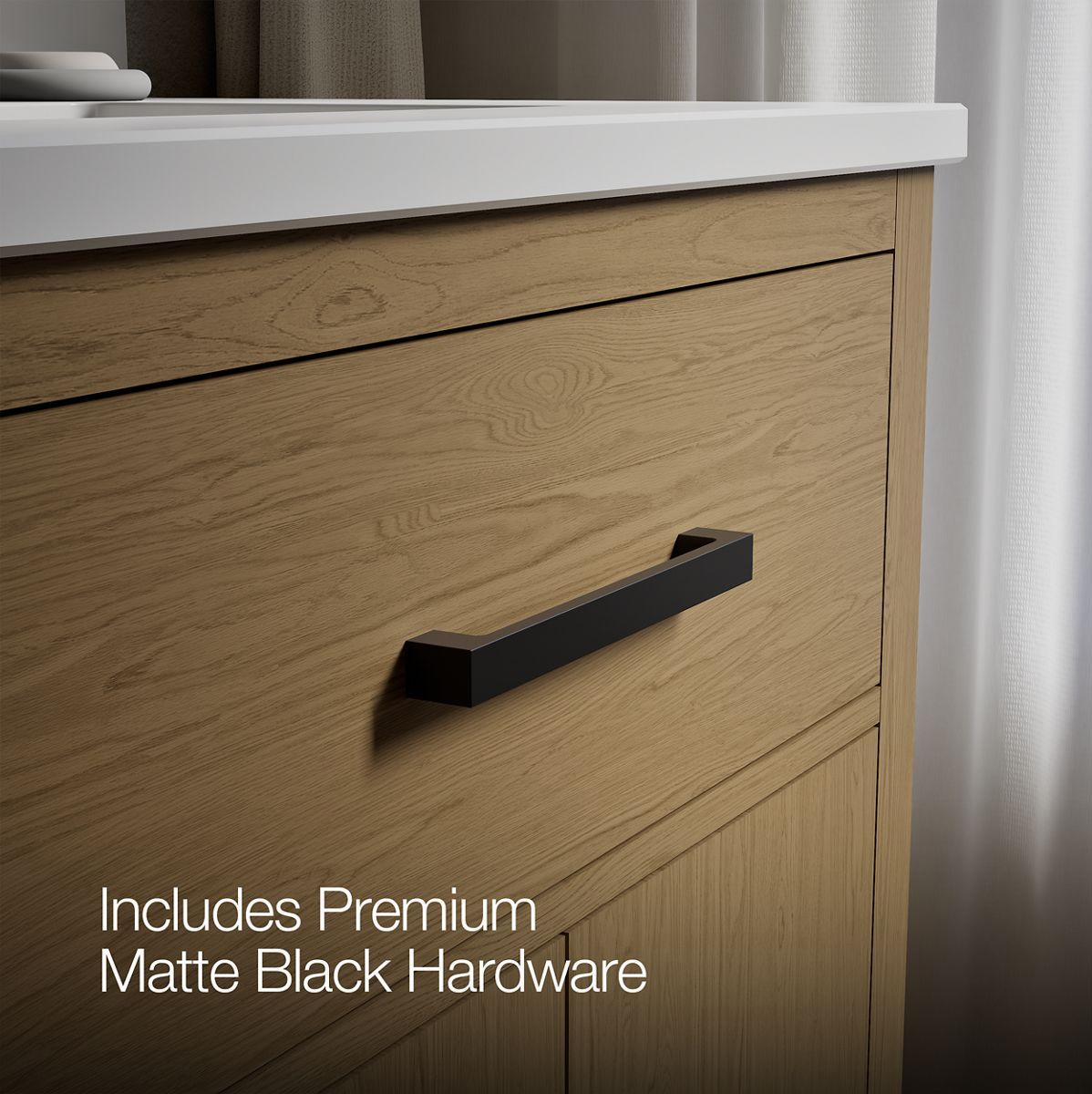 - Brushed Nickel hardware included on White, Atmos Grey, and Carbon Oak vanities, and Matte Black hardware on Light Oak vanities.