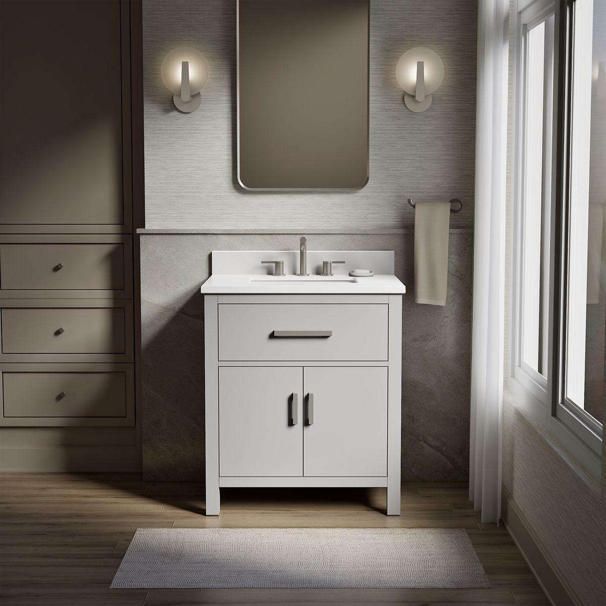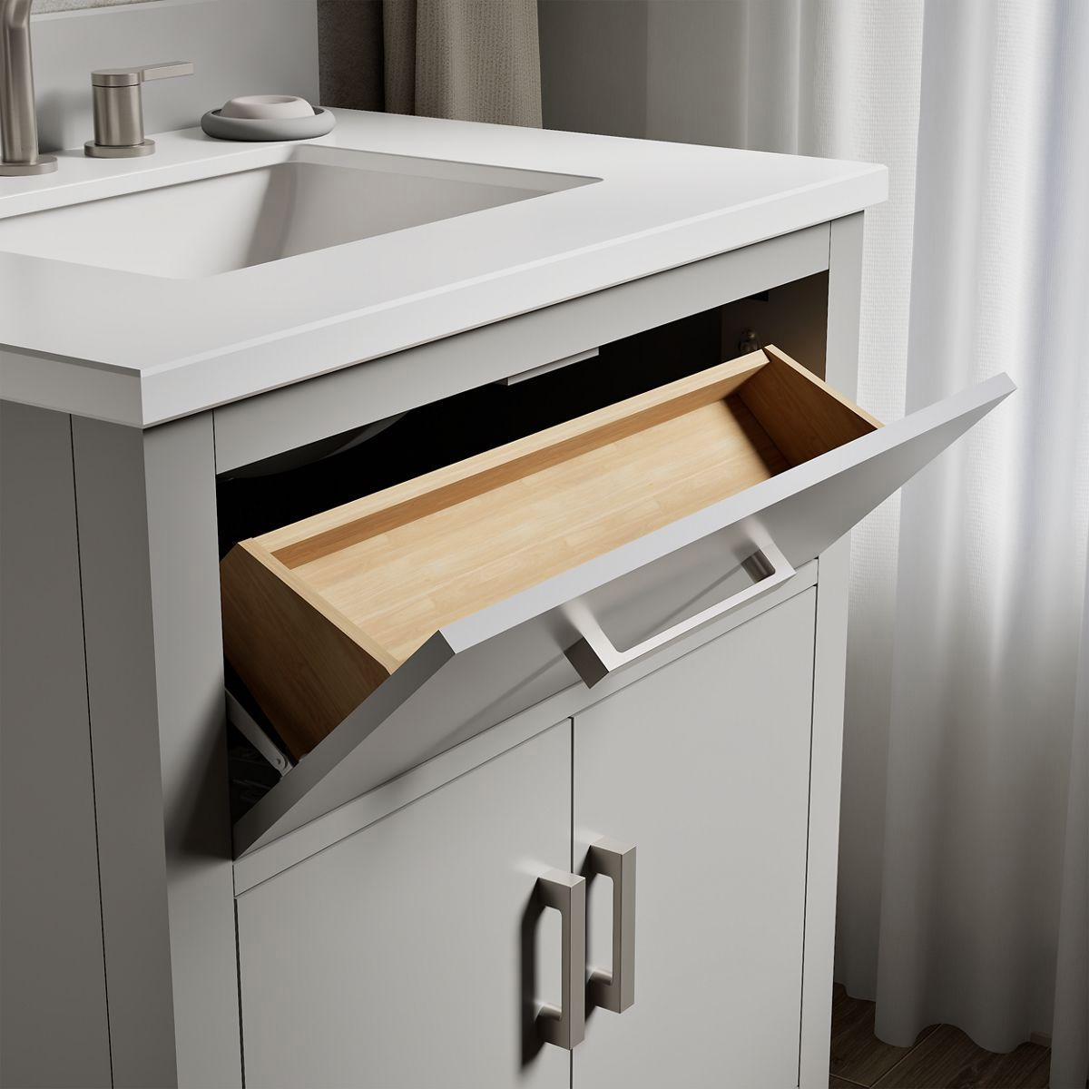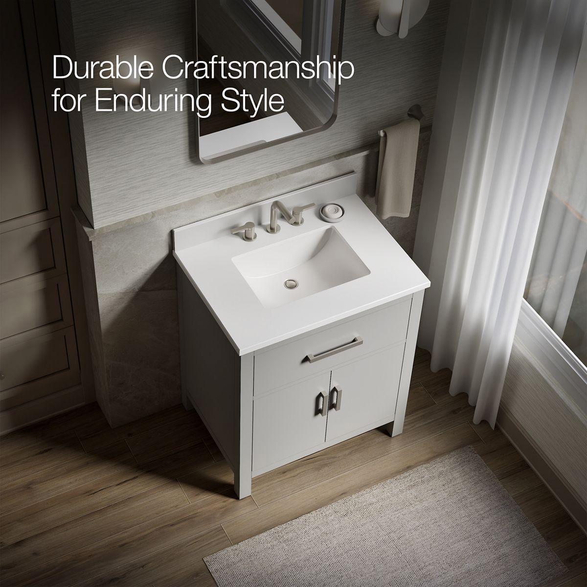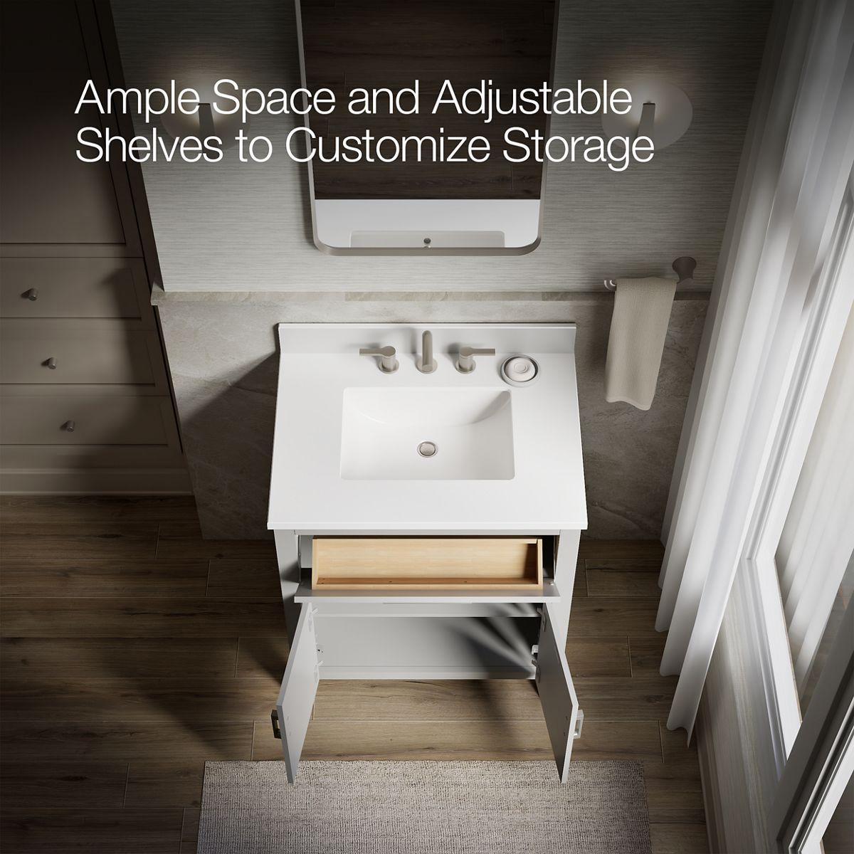 The Kresla vanity collection brings a quiet sophistication into your bathroom space with its with clean, architectural lines and range of finishes, and with its roomy interior, you'll find ample storage space to keep your bathroom organized and clutter-free. The Kresla 30" vanity set includes cabinet, quartz countertop with matching backsplash, sink, and hardware. With KOHLER, it’s easy to find the design solution that’s right for you.