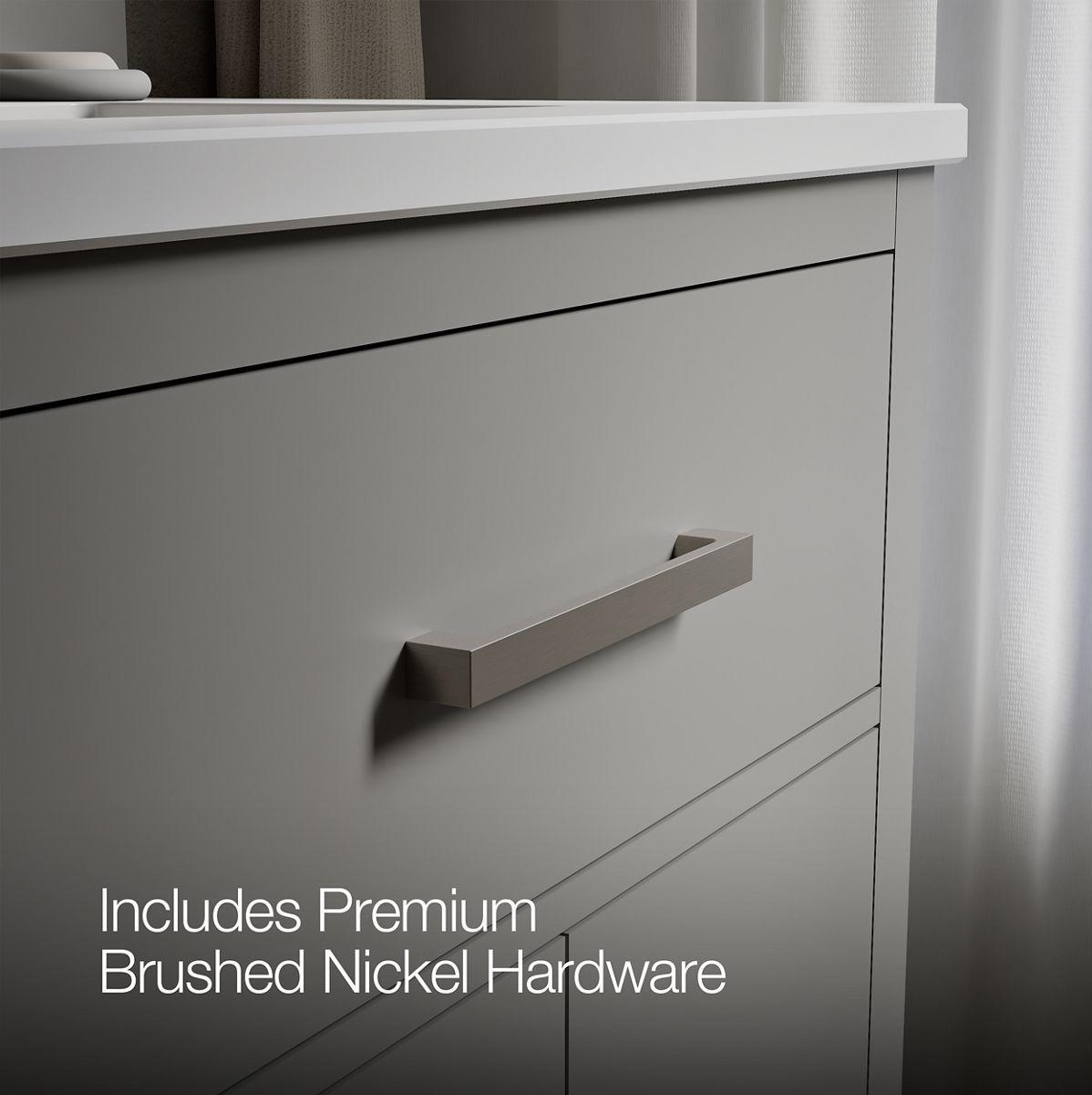 - Brushed Nickel hardware included on White, Atmos Grey, and Black Oak vanities, and Matte Black hardware on Light Oak vanities.