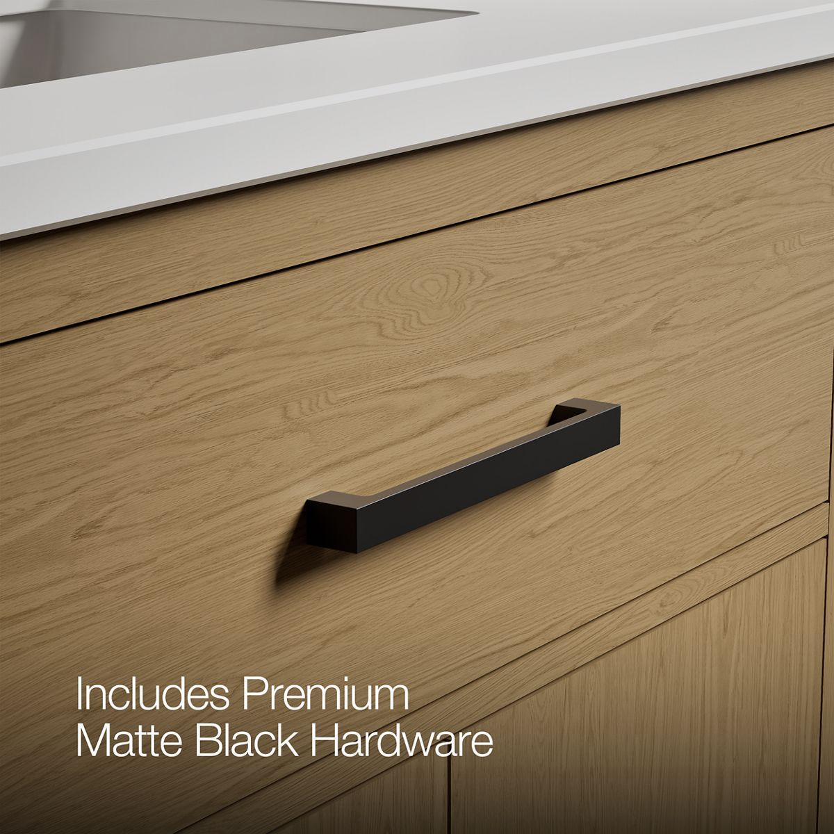 - Brushed Nickel hardware included on White, Atmos Grey, and Black Oak vanities, and Matte Black hardware on Light Oak vanities.