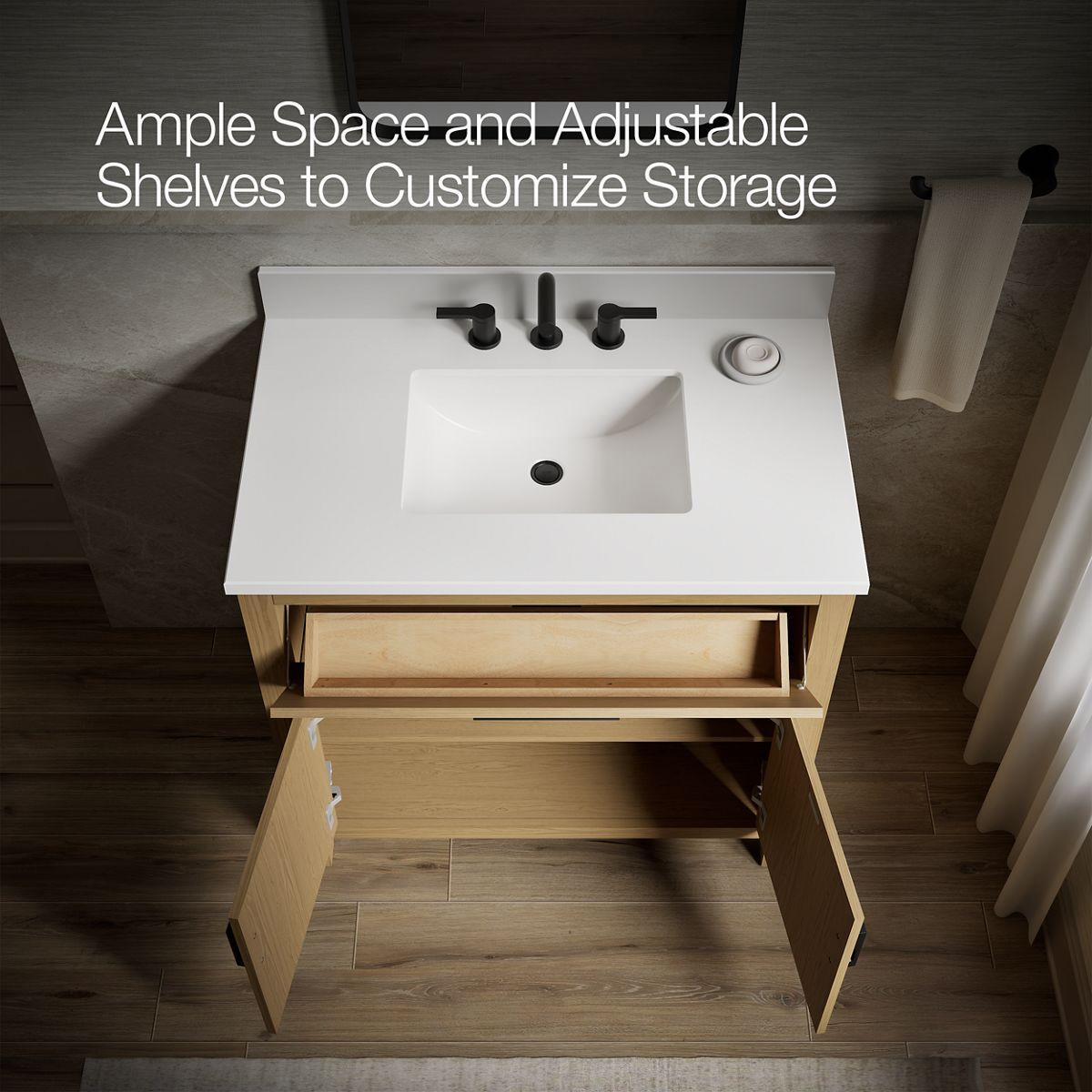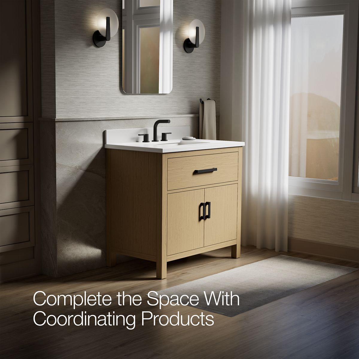 The Kresla vanity collection brings a quiet sophistication into your bathroom space with its with clean, architectural lines and range of finishes, and with its roomy interior, you'll find ample storage space to keep your bathroom organized and clutter-free. The Kresla 36" vanity set includes cabinet, quartz countertop with matching backsplash, sink, and hardware. With KOHLER®, it’s easy to find the design solution that’s right for you.