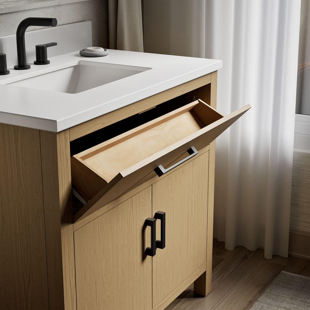 - Brushed Nickel hardware included on White, Atmos Grey, and Carbon Oak vanities, and Matte Black hardware on Light Oak vanities.
