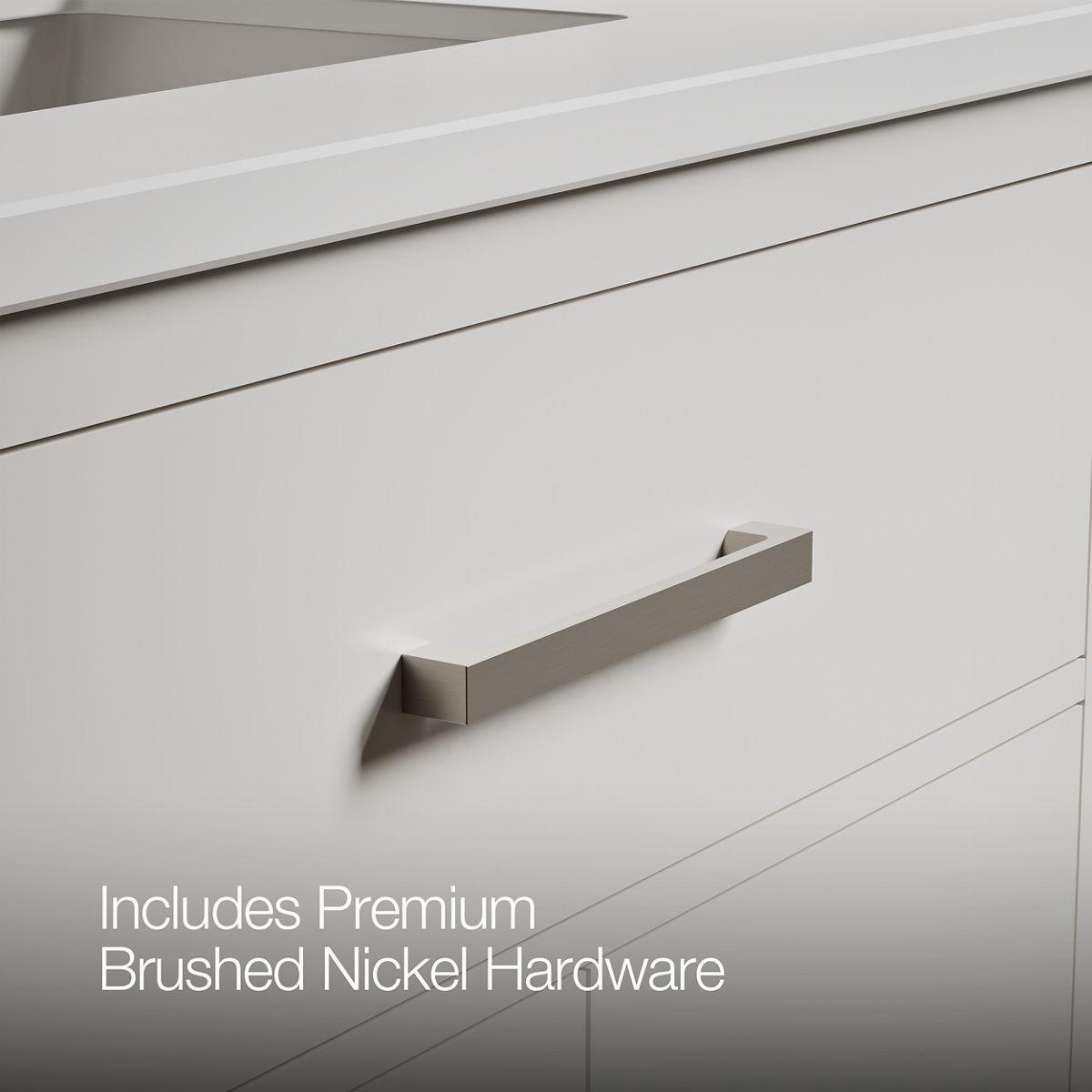 - Brushed Nickel hardware included on White, Atmos Grey, and Carbon Oak vanities, and Matte Black hardware on Light Oak vanities.