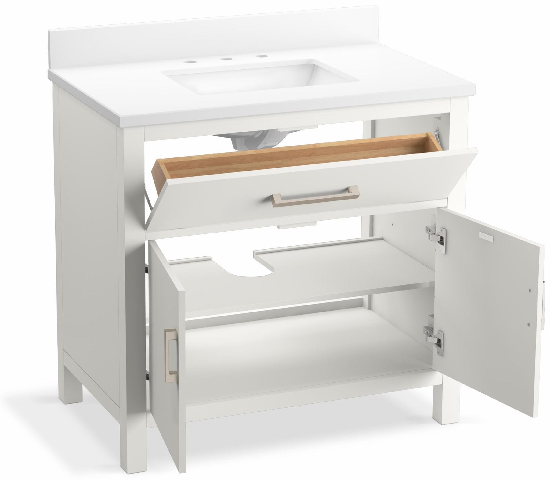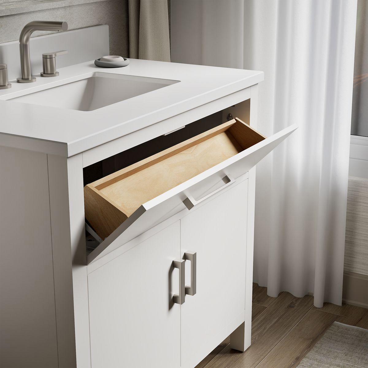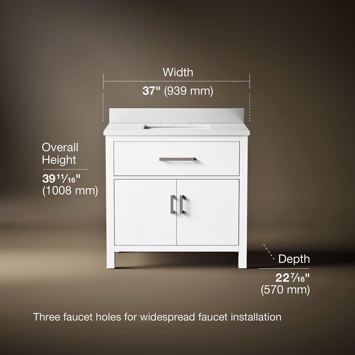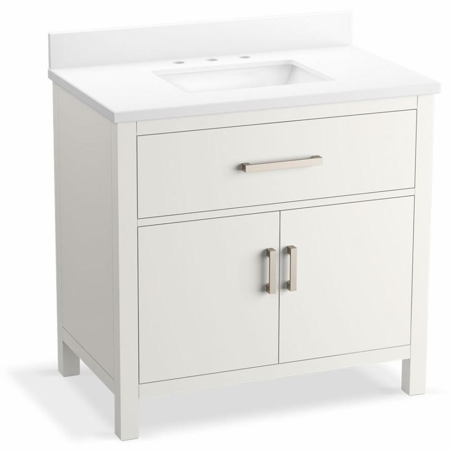 The Kresla vanity collection brings a quiet sophistication into your bathroom space with its with clean, architectural lines and range of finishes, and with its roomy interior, you'll find ample storage space to keep your bathroom organized and clutter-free. The Kresla 36" vanity set includes cabinet, quartz countertop with matching backsplash, sink, and hardware. With KOHLER, it’s easy to find the design solution that’s right for you.