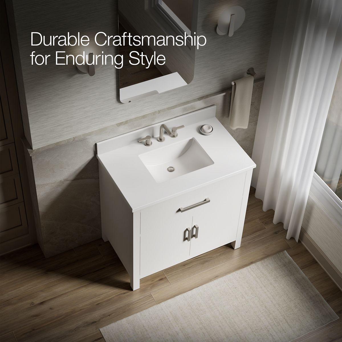- Pure White quartz vanity top and backsplash add beauty and long-lasting durability