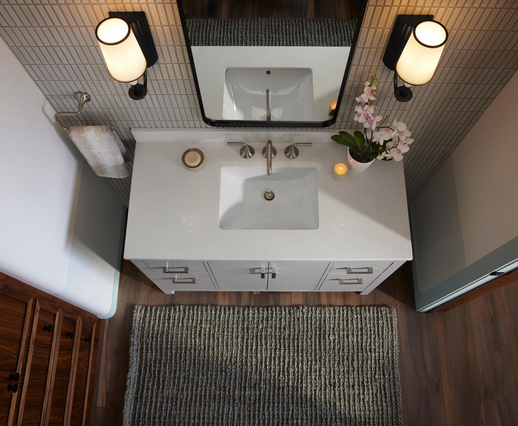 - White (GWT) quartz vanity top and backsplash add beauty and long-lasting durability