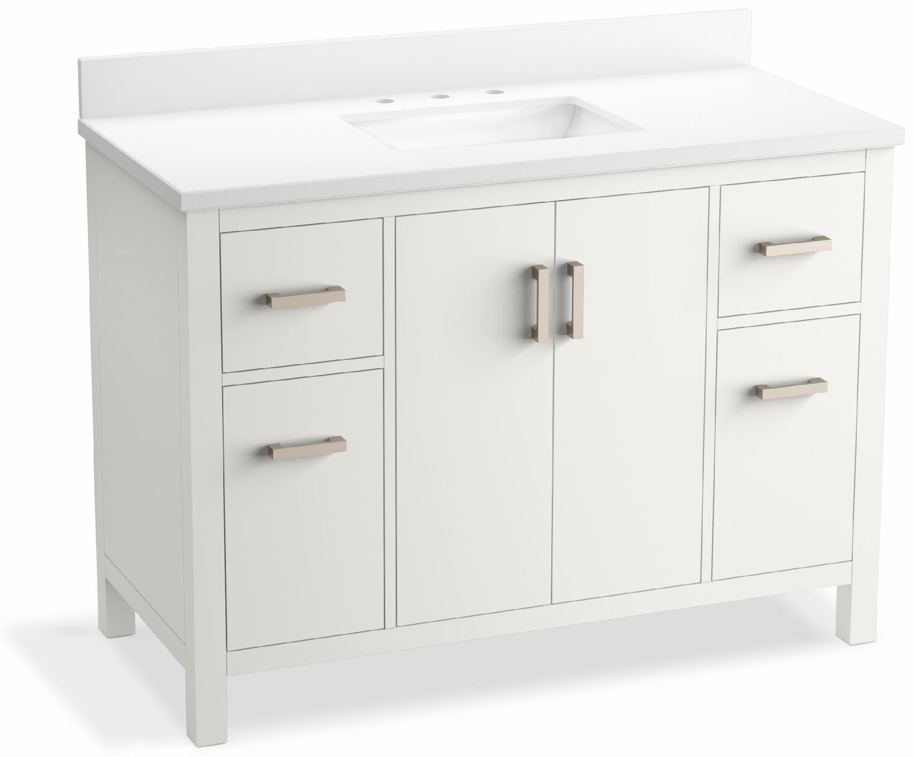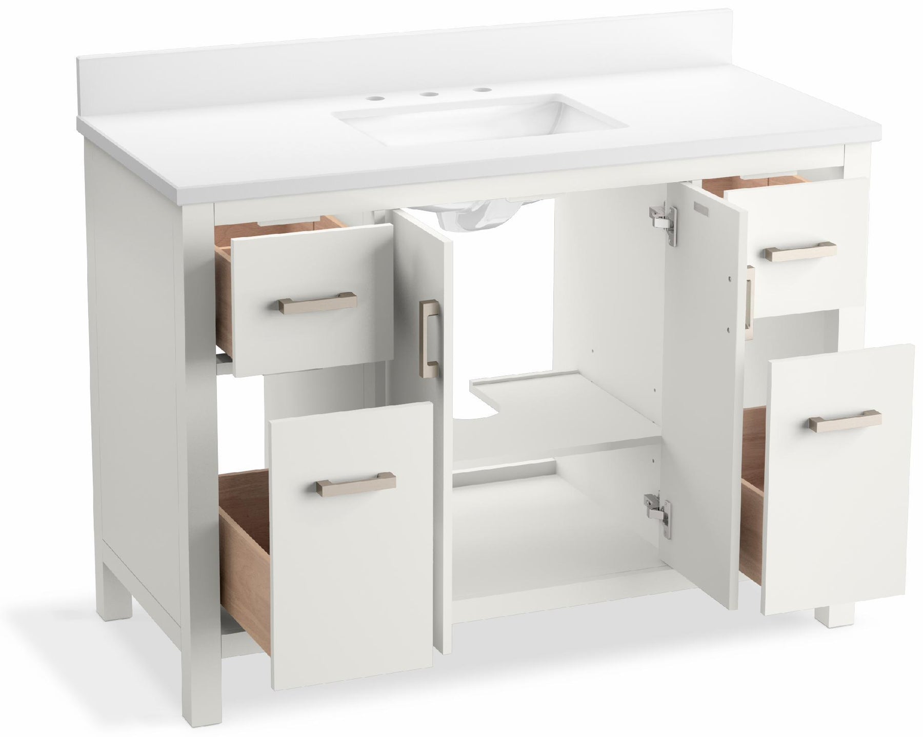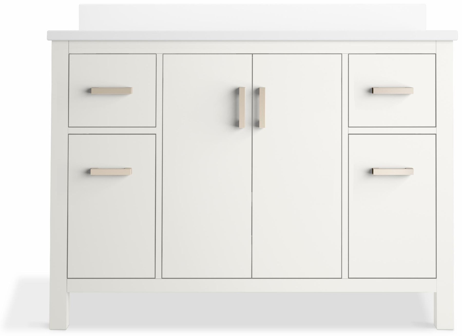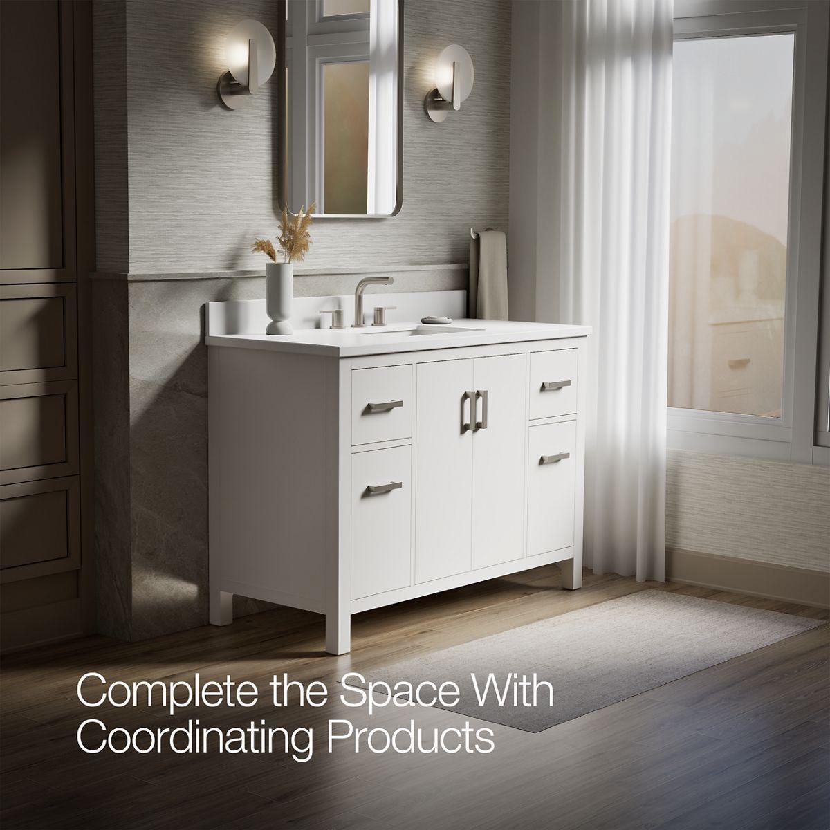 The Kresla vanity collection brings a quiet sophistication into your bathroom space with its with clean, architectural lines and range of finishes, and with its roomy interior, you'll find ample storage space to keep your bathroom organized and clutter-free. The Kresla 48" vanity set includes cabinet, quartz countertop with matching backsplash, sink, and hardware. With KOHLER, it’s easy to find the design solution that’s right for you.