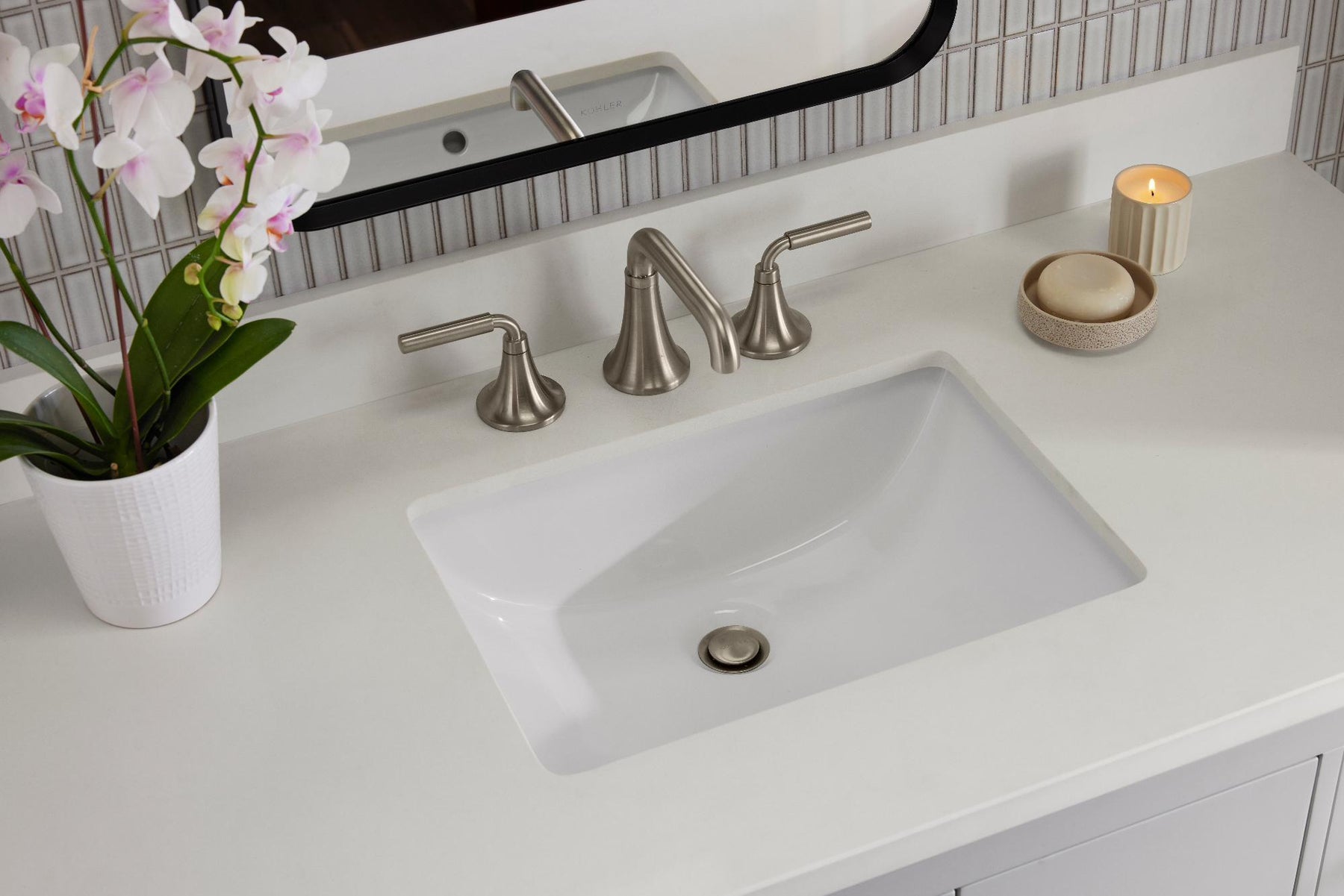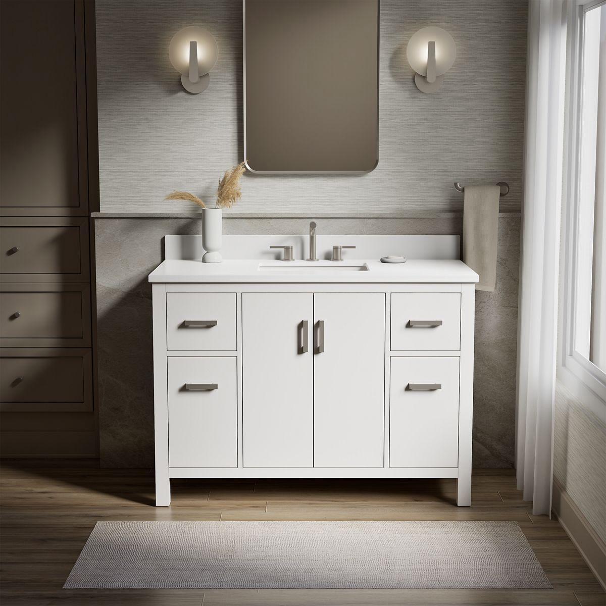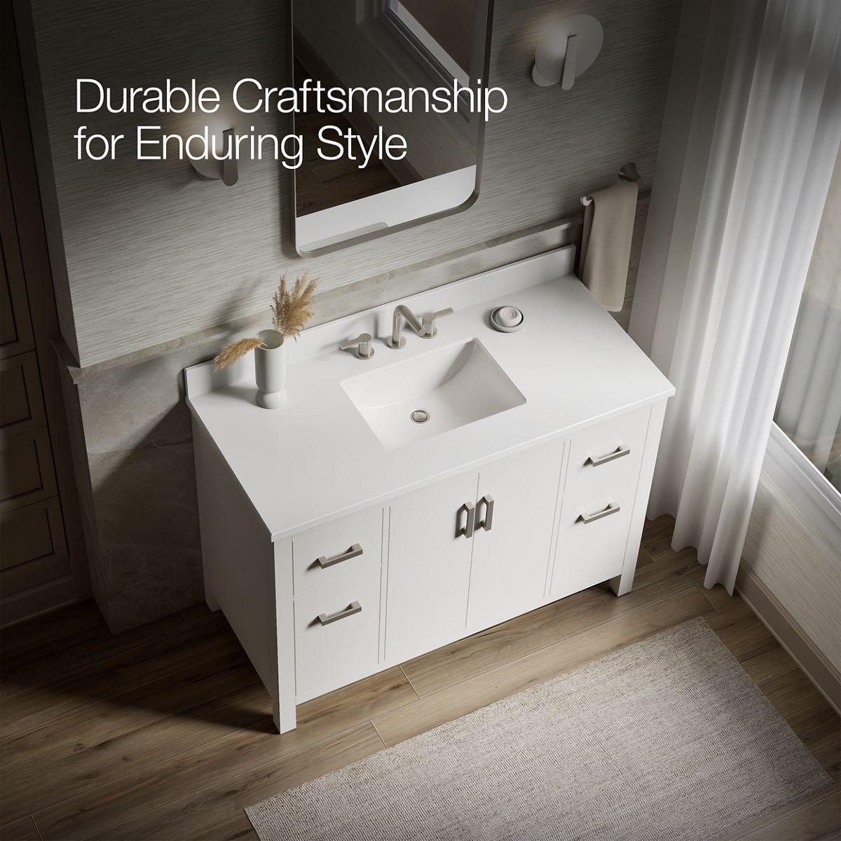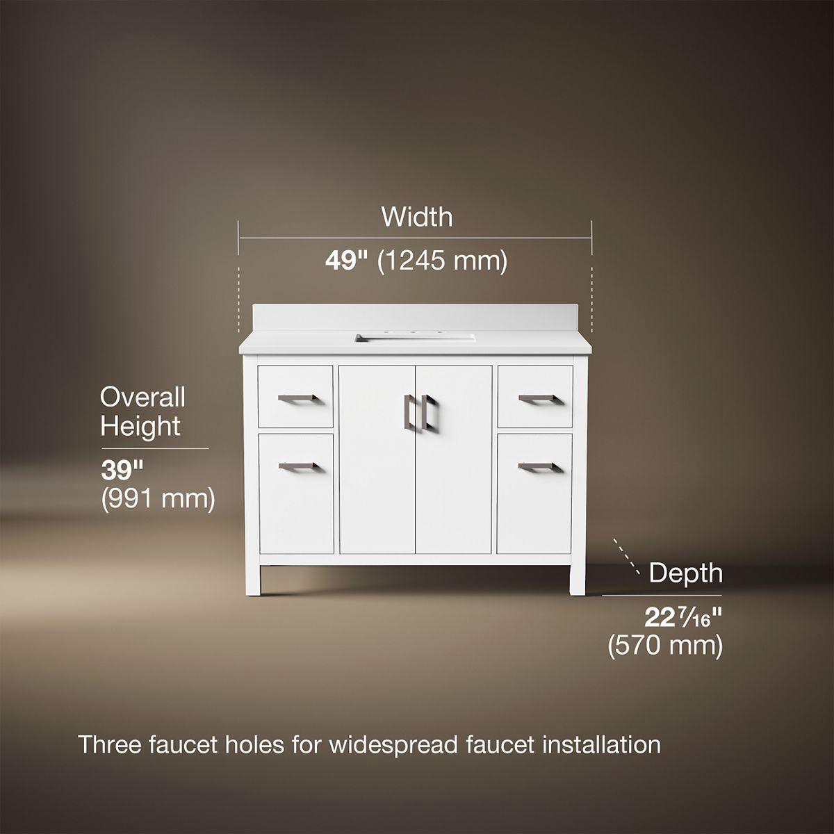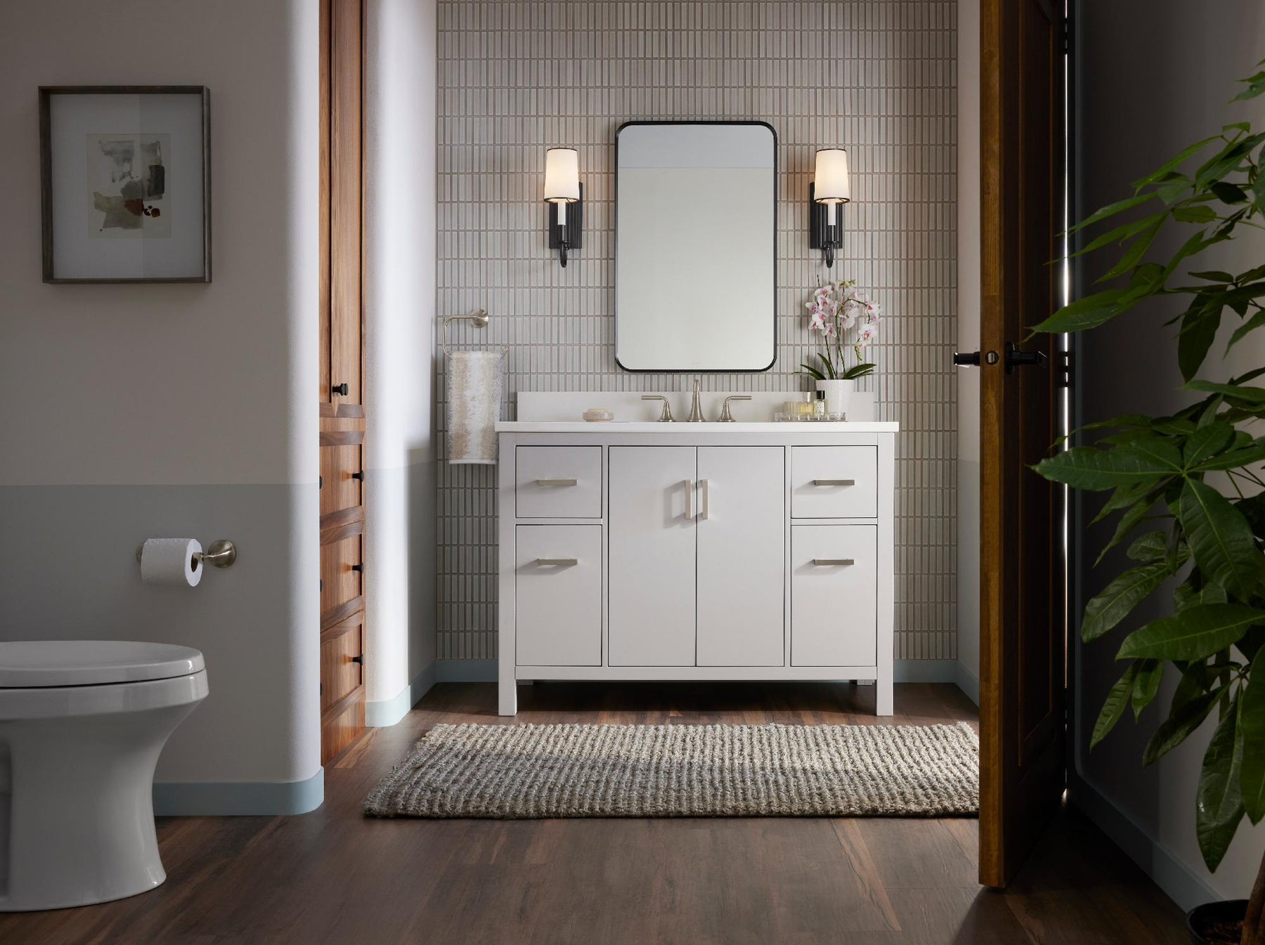 The Kresla vanity collection brings a quiet sophistication into your bathroom space with its with clean, architectural lines and range of finishes, and with its roomy interior, you'll find ample storage space to keep your bathroom organized and clutter-free. The Kresla 48" vanity set includes cabinet, quartz countertop with matching backsplash, sink, and hardware. With KOHLER, it’s easy to find the design solution that’s right for you.