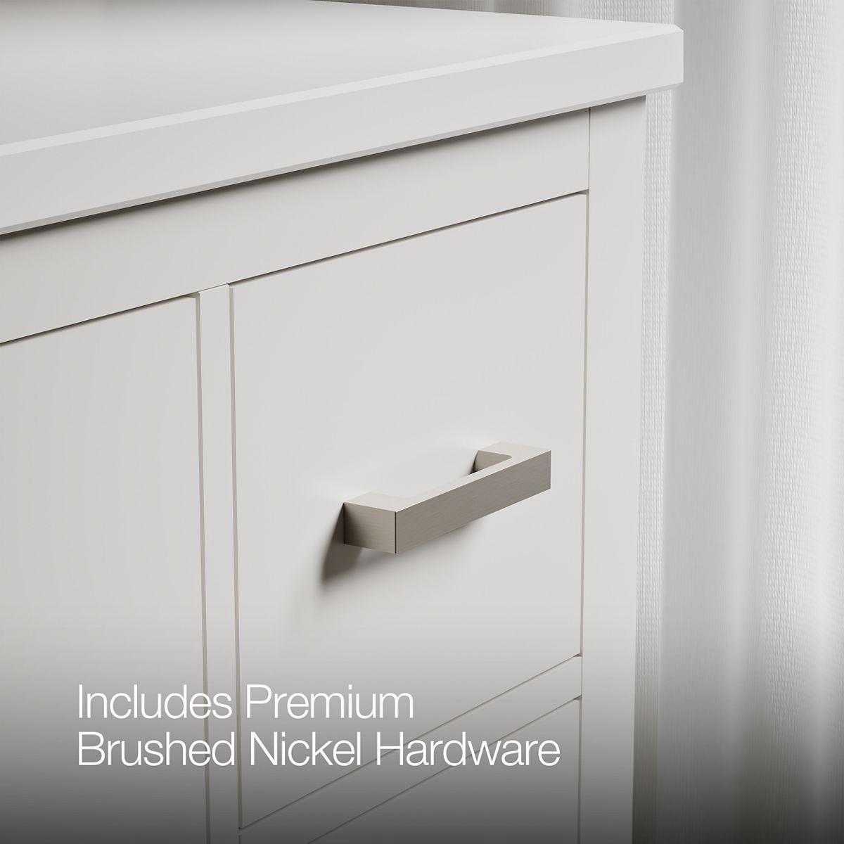- Brushed Nickel hardware included on White, Atmos Grey, and Carbon Oak vanities, and Matte Black hardware on Light Oak vanities.