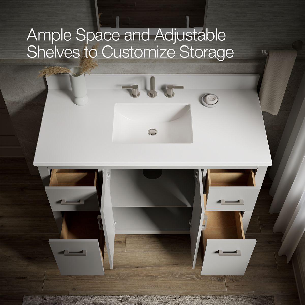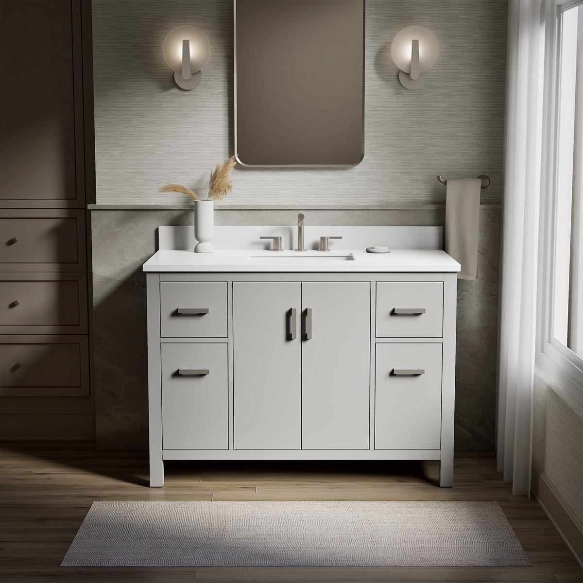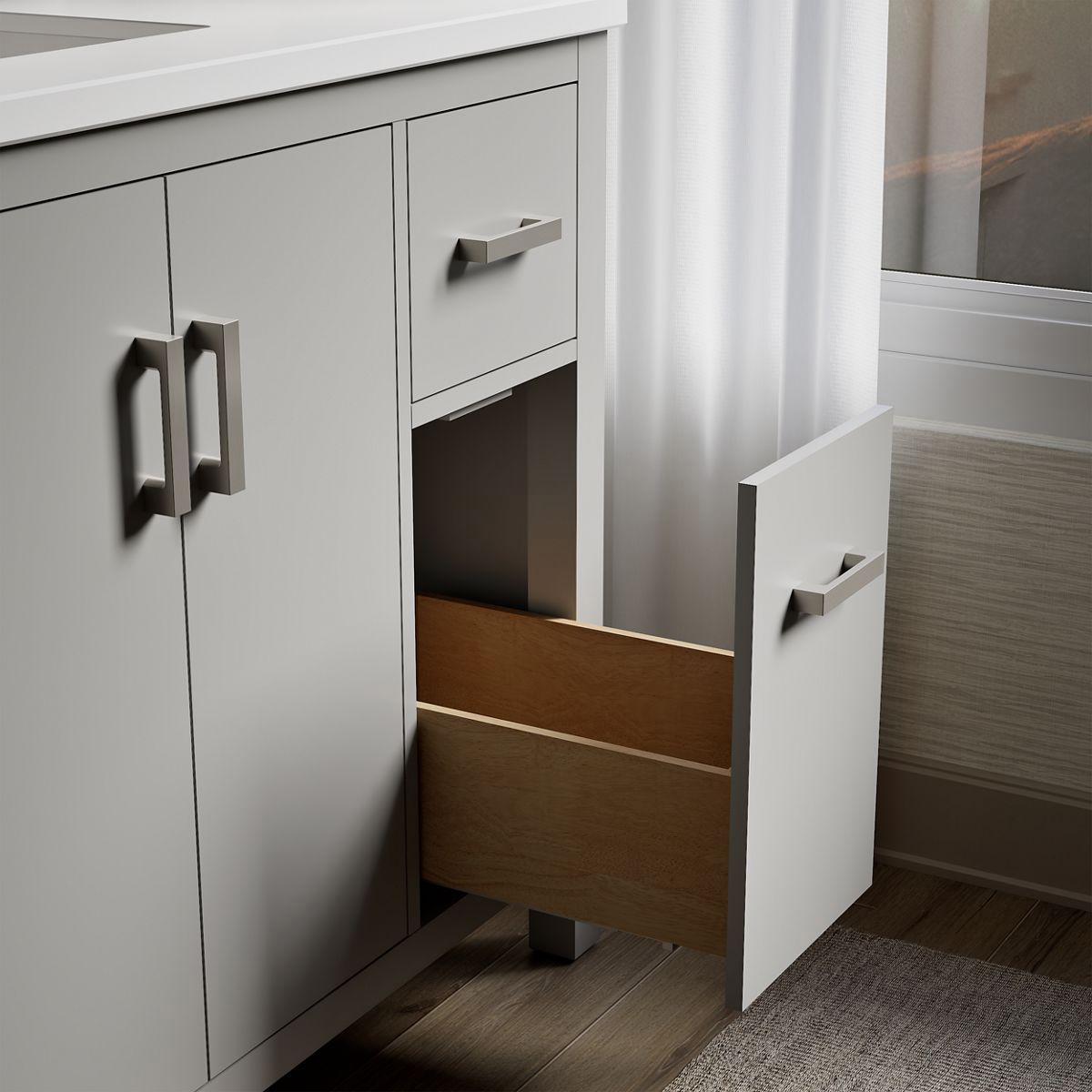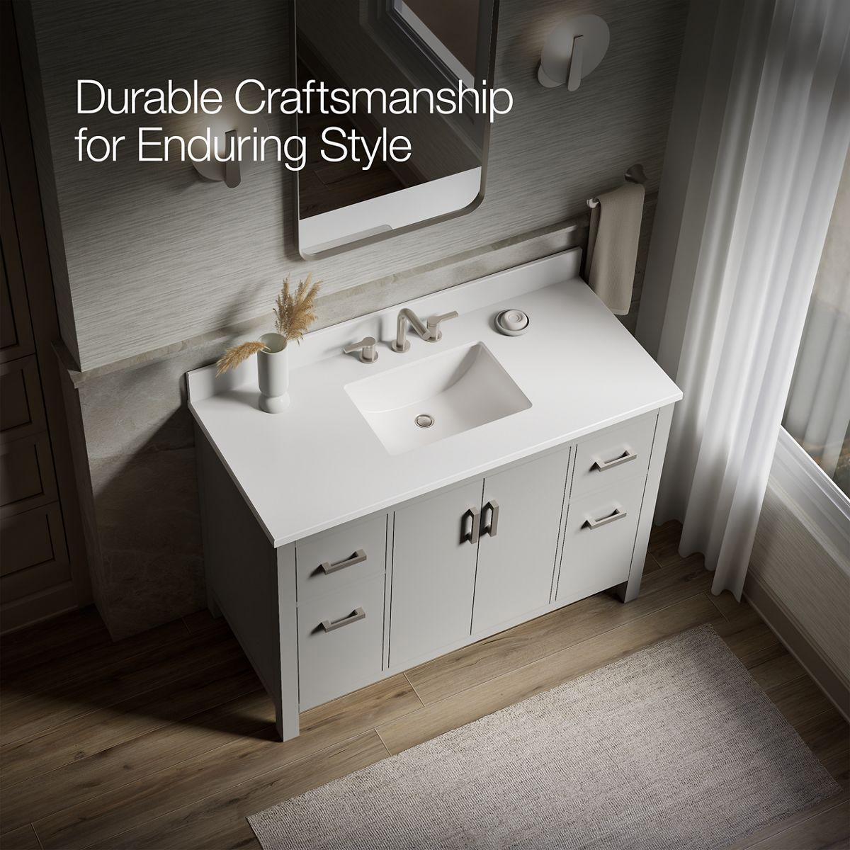 The Kresla vanity collection brings a quiet sophistication into your bathroom space with its with clean, architectural lines and range of finishes, and with its roomy interior, you'll find ample storage space to keep your bathroom organized and clutter-free. The Kresla 48" vanity set includes cabinet, quartz countertop with matching backsplash, sink, and hardware. With KOHLER, it’s easy to find the design solution that’s right for you.