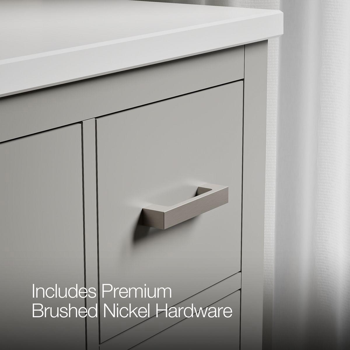 - Brushed Nickel hardware included on White, Atmos Grey, and Carbon Oak vanities, and Matte Black hardware on Light Oak vanities.