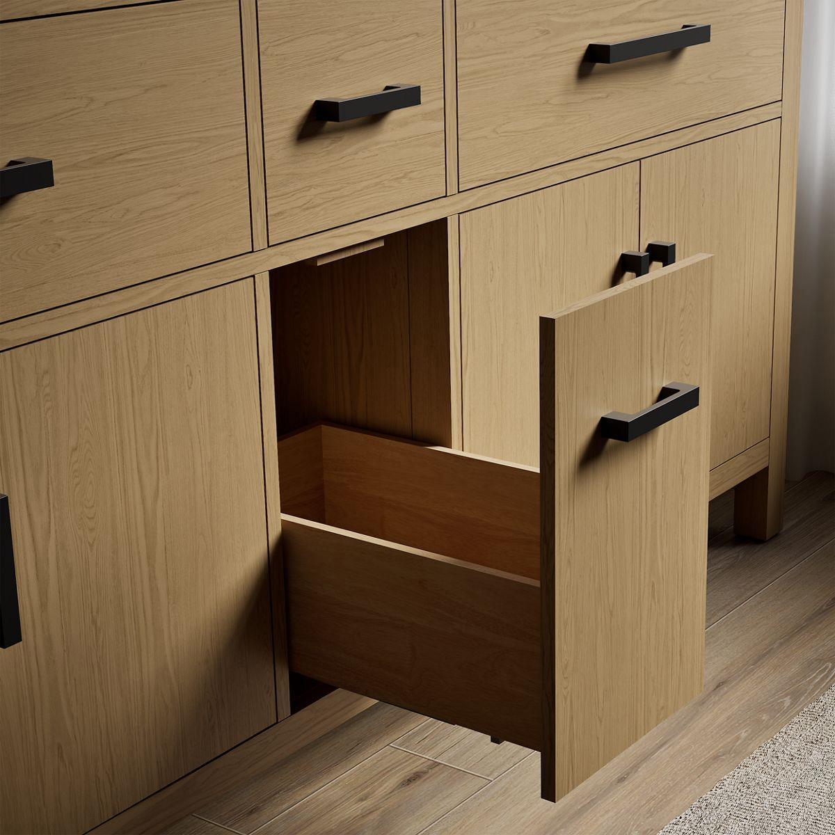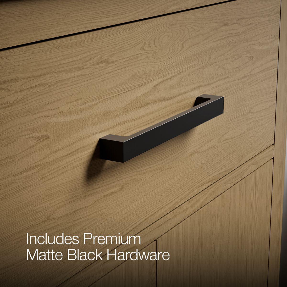 - Brushed Nickel hardware included on White, Atmos Grey, and Carbon Oak vanities, and Matte Black hardware on Light Oak vanities.
