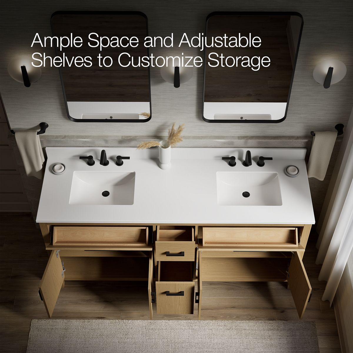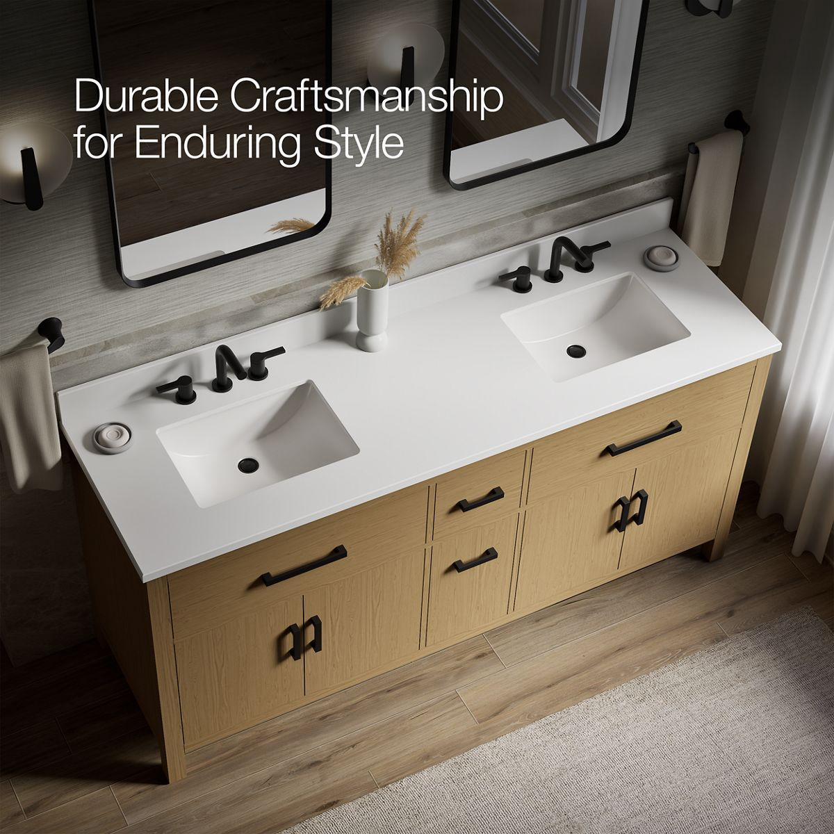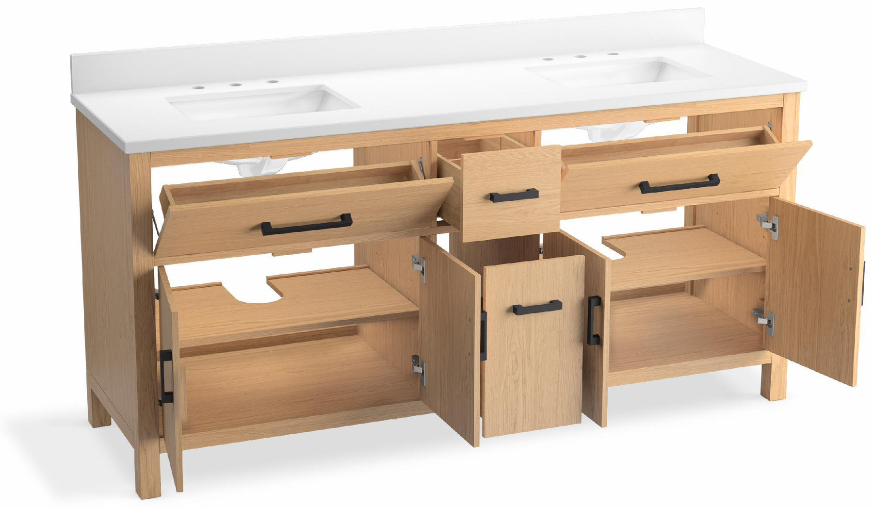 The Kresla vanity collection brings a quiet sophistication into your bathroom space with its with clean, architectural lines and range of finishes, and with its roomy interior, you'll find ample storage space to keep your bathroom organized and clutter-free. The Kresla 72" vanity set includes cabinet, quartz countertop with matching backsplash, two sinks, and hardware. With KOHLER, it’s easy to find the design solution that’s right for you.